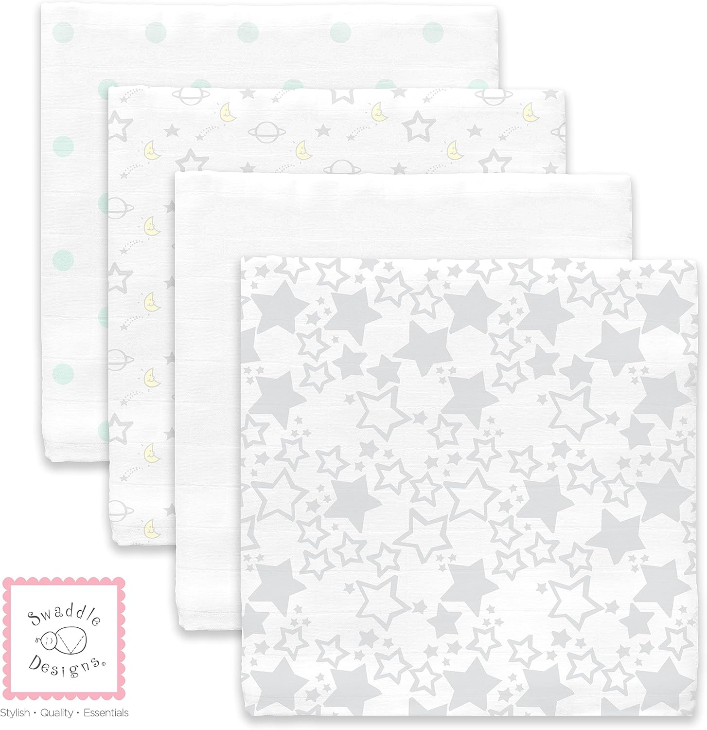 SwaddleDesigns Cotton Muslin Swaddle Blankets, Set of 4, Receiving Blankets for Baby Boys & Girls, Best Shower Gift, 46x46 inches, Goodnight Starshine