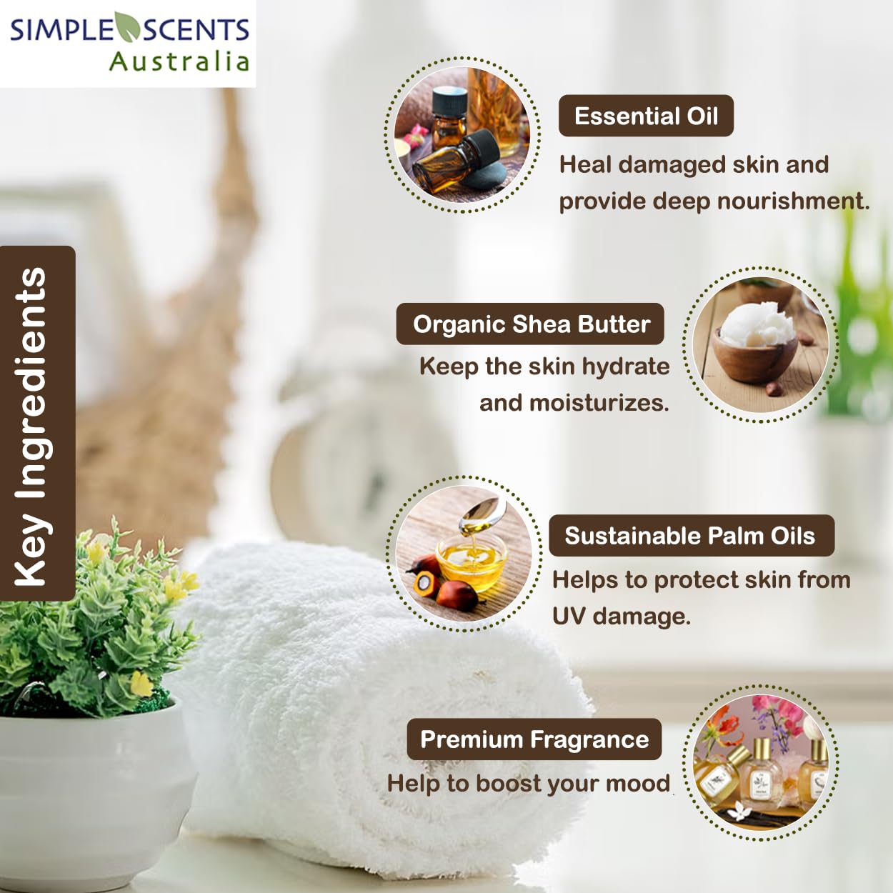- ๐ฟ Natural Ingredients | Non Toxic Bar Soap: Our Sandalwood scented natural soap bars are made with the finest Australian and globally sourced ingredients and sustainable plant oils. Unlike commercially produced soaps, these natural soap bars contain no harsh chemicals or parabens and SLS, HEDP or EDTA. Australian soap made using pure plant oils and organic shea butter, these natural soaps deliver a creamy lather that leaves skin soft, smooth, and refreshed.