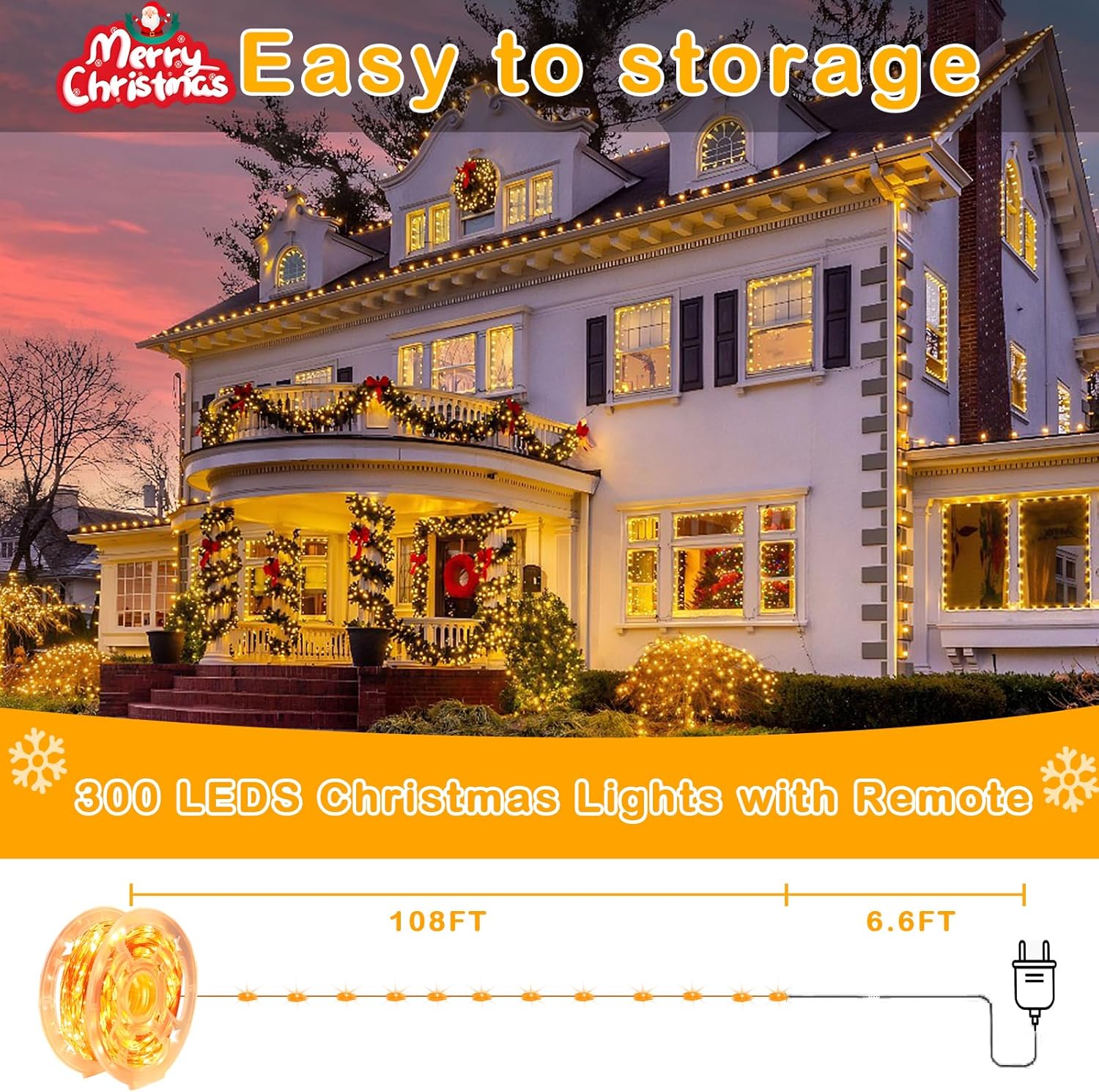- Package Includes: 1x 300 LED holiday lights outdoor with reel; 1 x 24 keys remote control; 1 x UL listed plug; 1 x user manual