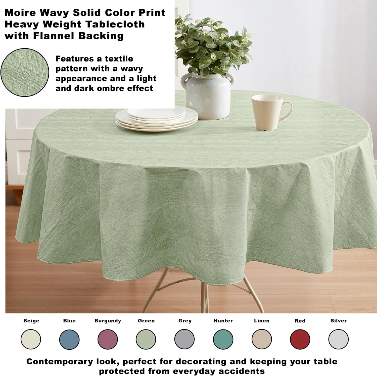 - Newbridge Vinyl Flannel Backed Tablecloth, 70 inch Round, Sage Green Moire Wavy Solid Design, Waterproof Heavyweight Indoor/Outdoor Table Cover, Wipe Clean Easy Care