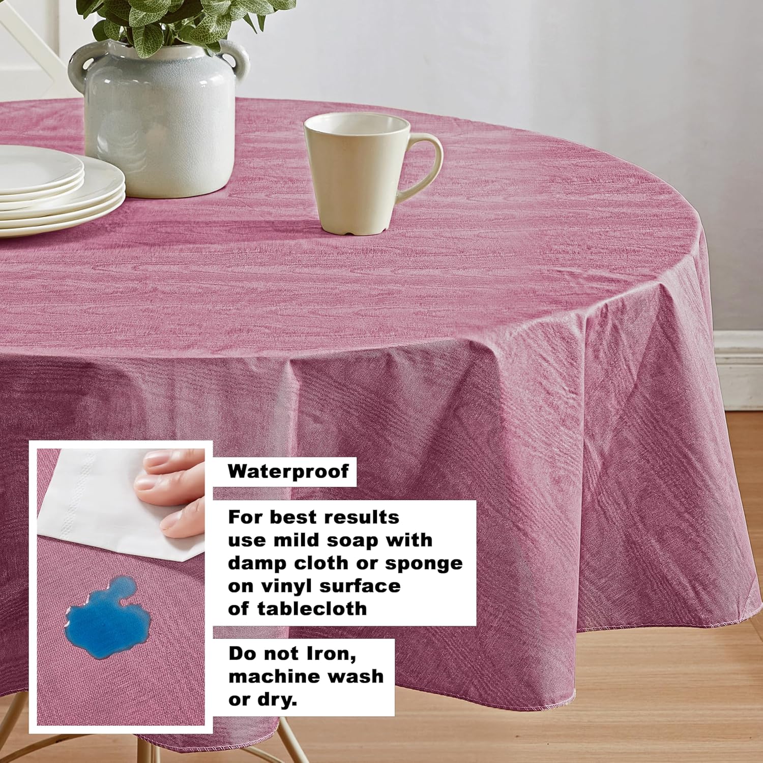 - CARE INSTRUCTIONS: Heavy Weight Vinyl Flannel Backed Tablecloth - For best results use mild soap with damp cloth or sponge on vinyl surface of tablecloth. Do not Iron or machine wash or dry. Materials: Surface 100% Vinyl, Flannel Backing: 100% Polyester