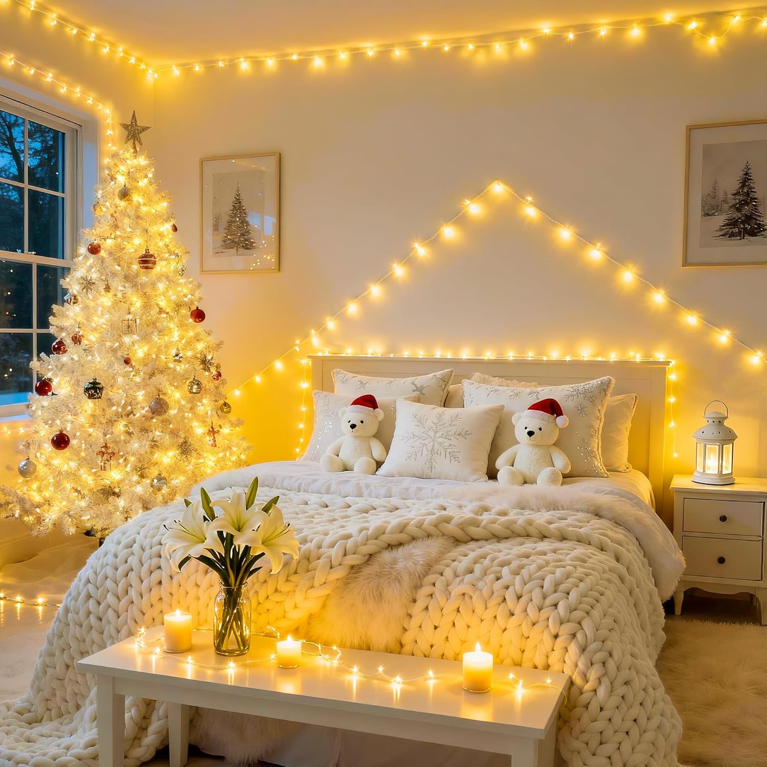 - 【Christmas String Lights Indoor for Bedroom】Our Christmas lights as an perfect string lights for bedroom decor. Draping them around windows, walls adds elegant and warmth. Adorning your entire bedroom, using multiple sets of string lights can instantly brighten and open up a space. Beyond bedrooms, they are versatile for dining area, Children's Rooms, reading nook, front door. In the fall, as a fall lights can create a cozy atmosphere for fireplace mantel fall decor, make the Christmas festival more vivid.