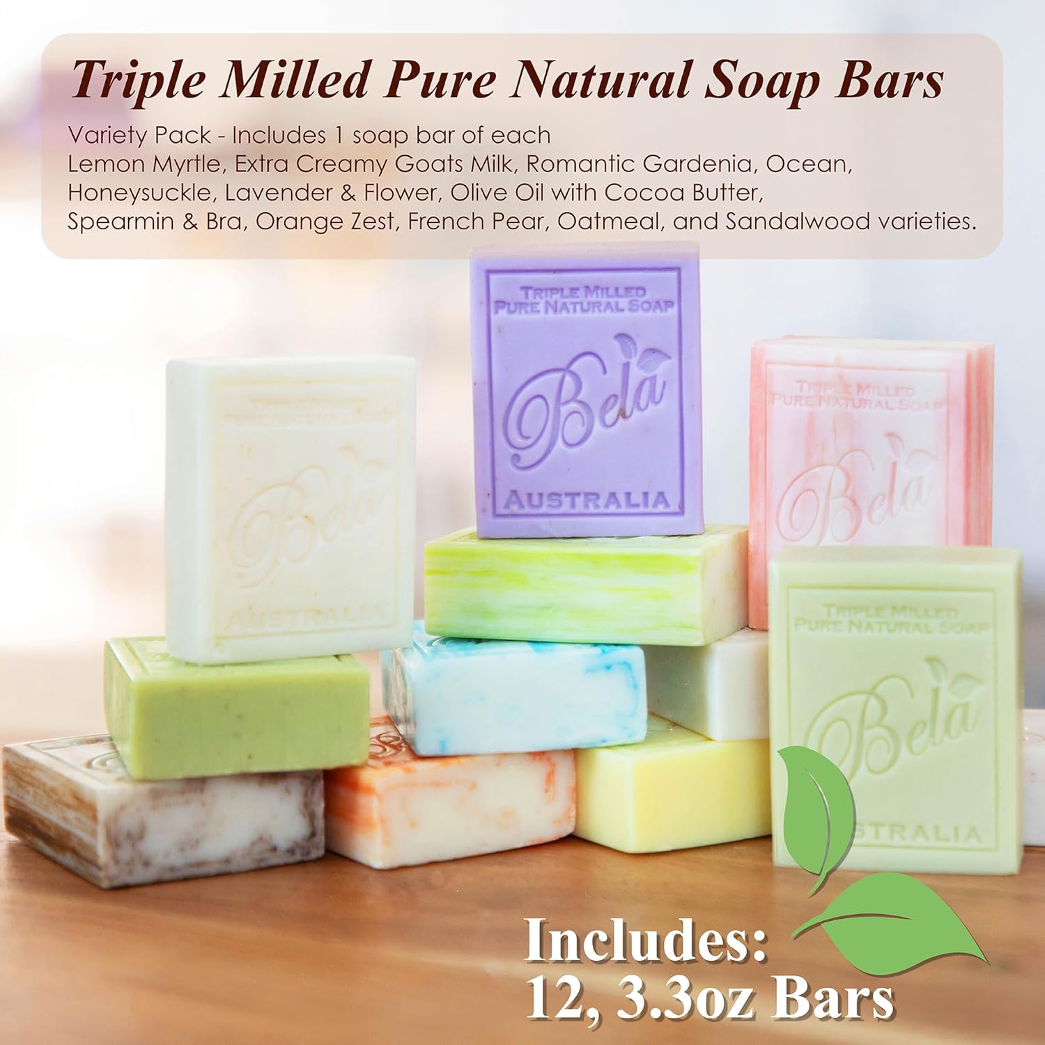 BELA Triple Milled Soap Variety Pack 3.3 OZ Pack of 12, Long Lasting French Triple Milled Bar Soap with Organic Shea Butter, Hand, Face and Body Soap Bar, Made in Australia