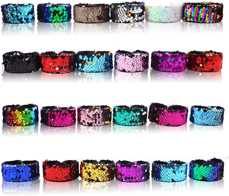 - ❤Pretty Charming Colors Bracelets:package includes 24pcs 8.7" x 1.2" squin slaps,rainbow,gold,pink,purple,silver,etc,perfect for younger children,teens and adults,you can share with your friends and enjoy joyful family time.