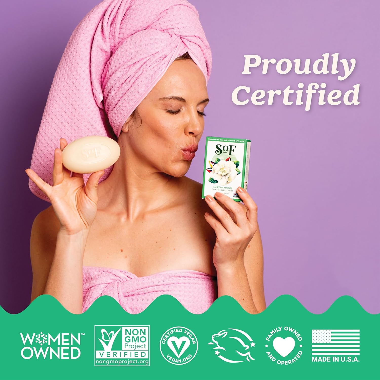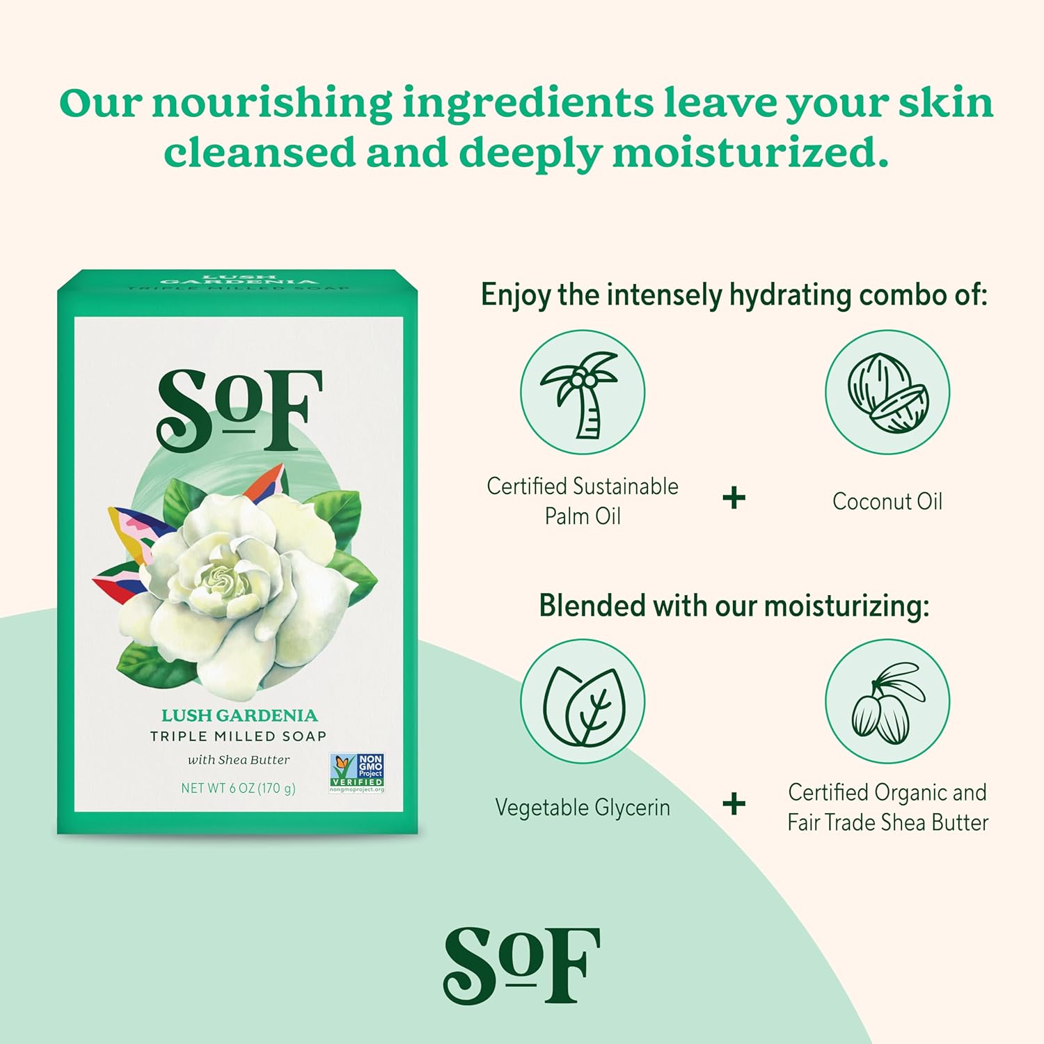 - FRESH & FLORAL: Our Lush Gardenia Bar Soap is infused with luscious gardenia, white florals, and musk sparking thoughts of the summery elegance of white gardenia blooms and greens on a warm starry night.