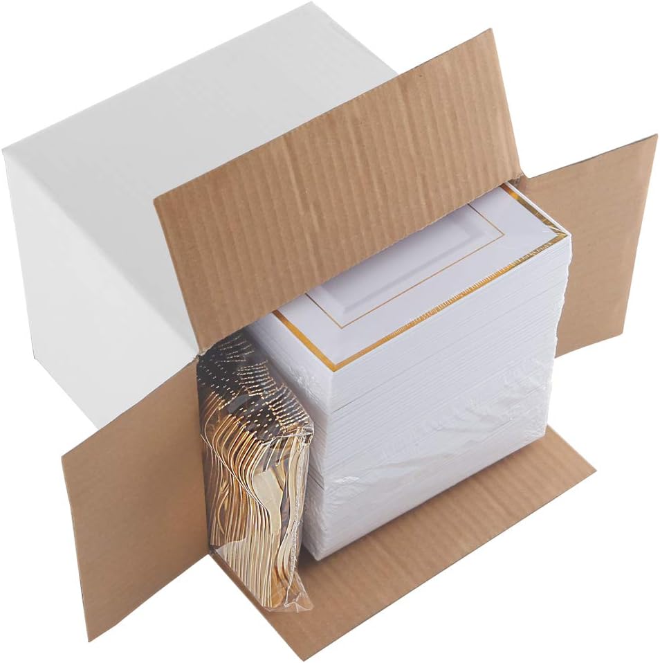 - SAFETY MATERIAL: 100% food grade, non-toxic, BPA-free plastic! Those gold plastic dessert plates and gold plastic forks are safe you and your guests. Solid, durable, heavy duty disposable plates ensure won't scratch or break easily.