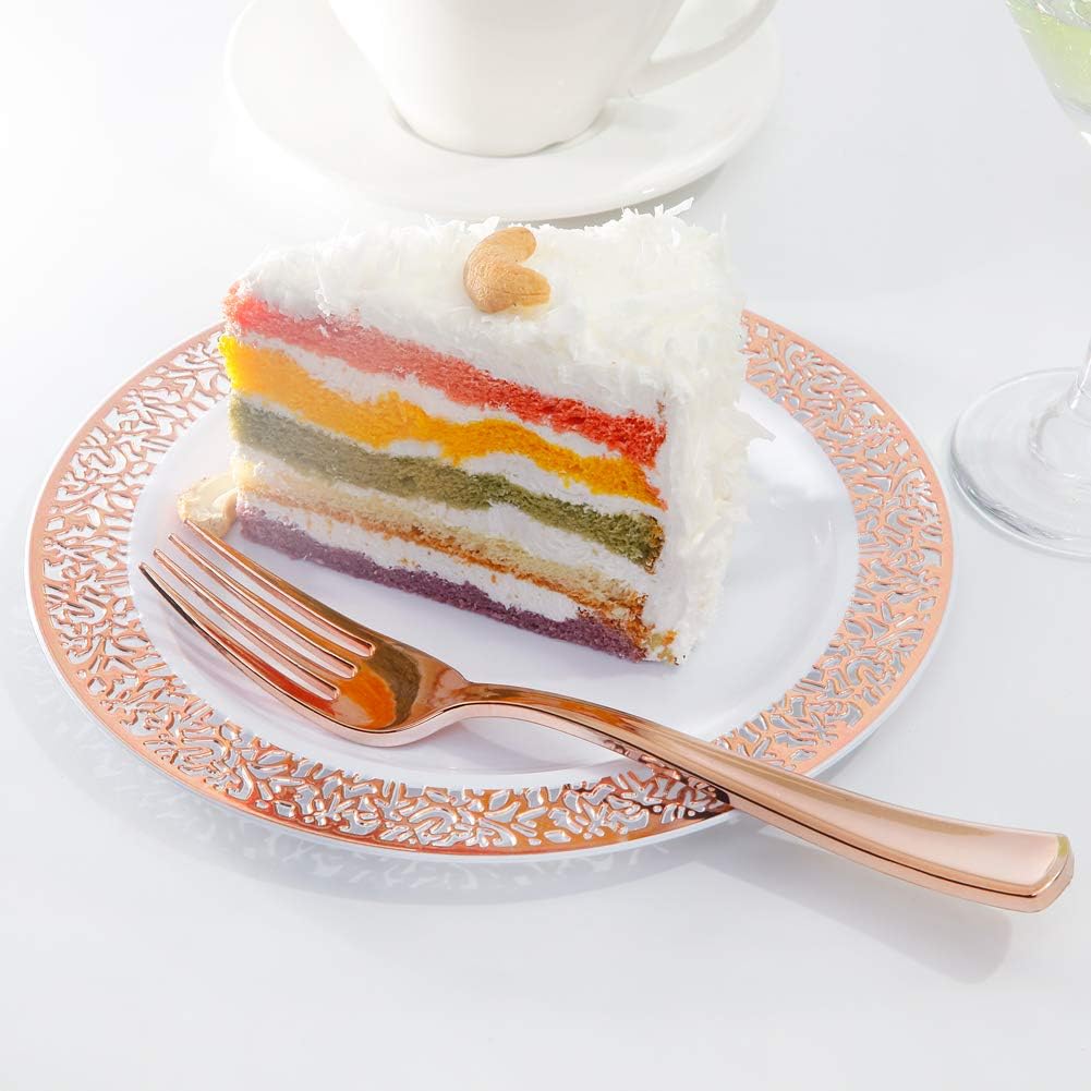 - BEAUTIFUL DESIGN: Elgant lace and modern design, our 100pack rose gold dessert forks are match well with 100pack rose gold plates. Your guests will amazing as they view the beautifully dinnerware set.
