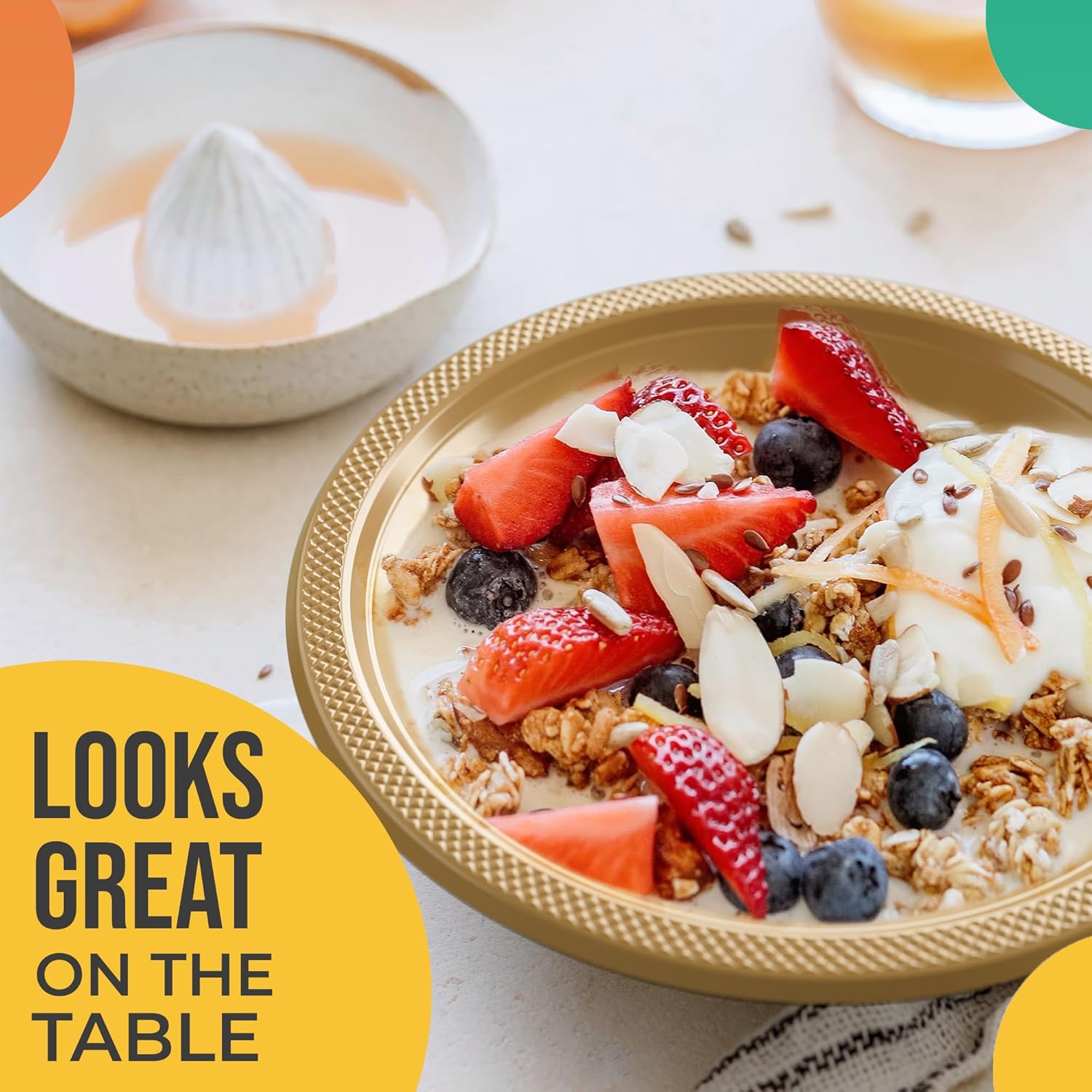 - Party Essential: These Gold plastic bowls disposable for party are a must-have for your paper & plastic household supplies. These disposable bowls for party are designed to elevate the dining experience. Use them as disposable cereal bowls or microwavable disposable bowls these heavy duty bowls for hot soup disposable are sure to meet your party needs