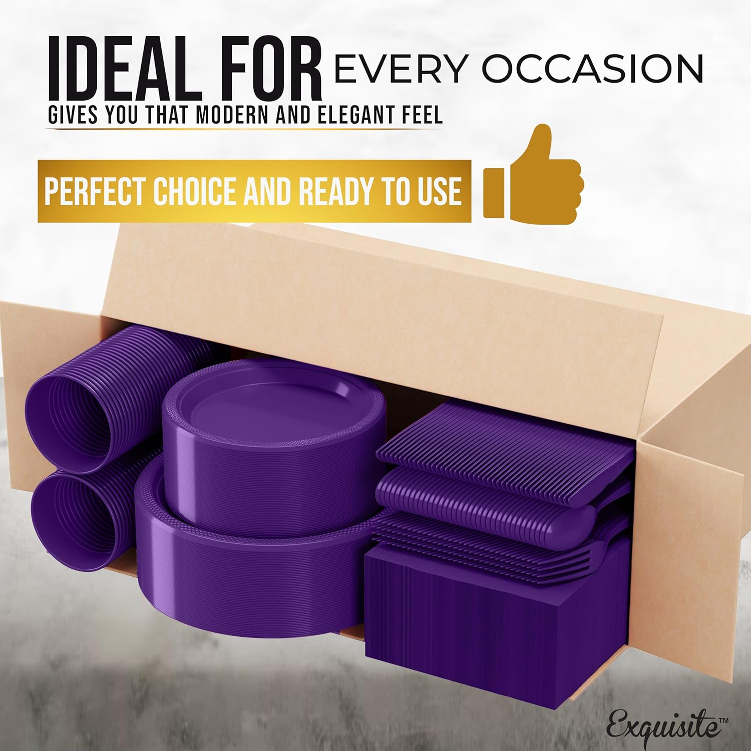 - All Occasions: From family dinners to special events, our purple plates will add style to your table. These Purple Plastic Plates for Party sets, complete with napkins, utensils, & plastic cups, are great for parties or daily use. The plates and napkins party supplies are a must-have for a seamless dining experience. Enjoy our disposable purple plates set at your next event!