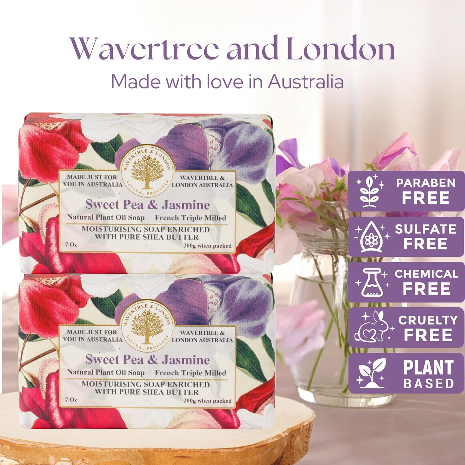 Wavertree & London Sweet Pea & Jasmine Scented Natural Soap (2 Bars), 7oz Moisturizing French Triple Milled Soap Bars enriched with shea butter - Pure Plant Based Bath & Body Bars for All Skin Types