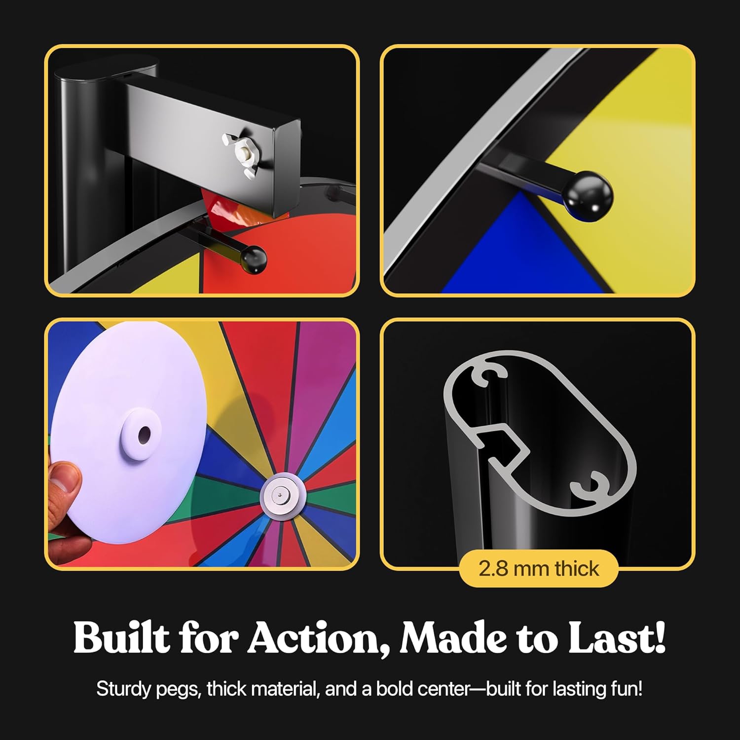 - Heavy Duty Base: Heavy-duty base stand and thick pole ensures a balanced and smooth spin every time! Perfect as a prize wheel spinner with stand or a wheel of fortune! This spin wheel for prizes with stand will last for years!