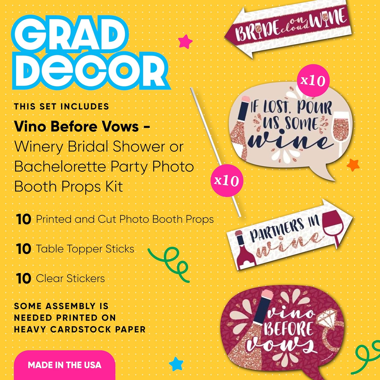 - 10-Piece Funny Vino Before Vows Photo Booth Props Kit INCLUDES 10 wine arrow and speech bubble photo booth props, 10 wooden dowel sticks and stickers for assembly. EASY ASSEMBLY: Simply attach the printed DIY photo booth props to the wooden dowels with included reinforcing stickers.