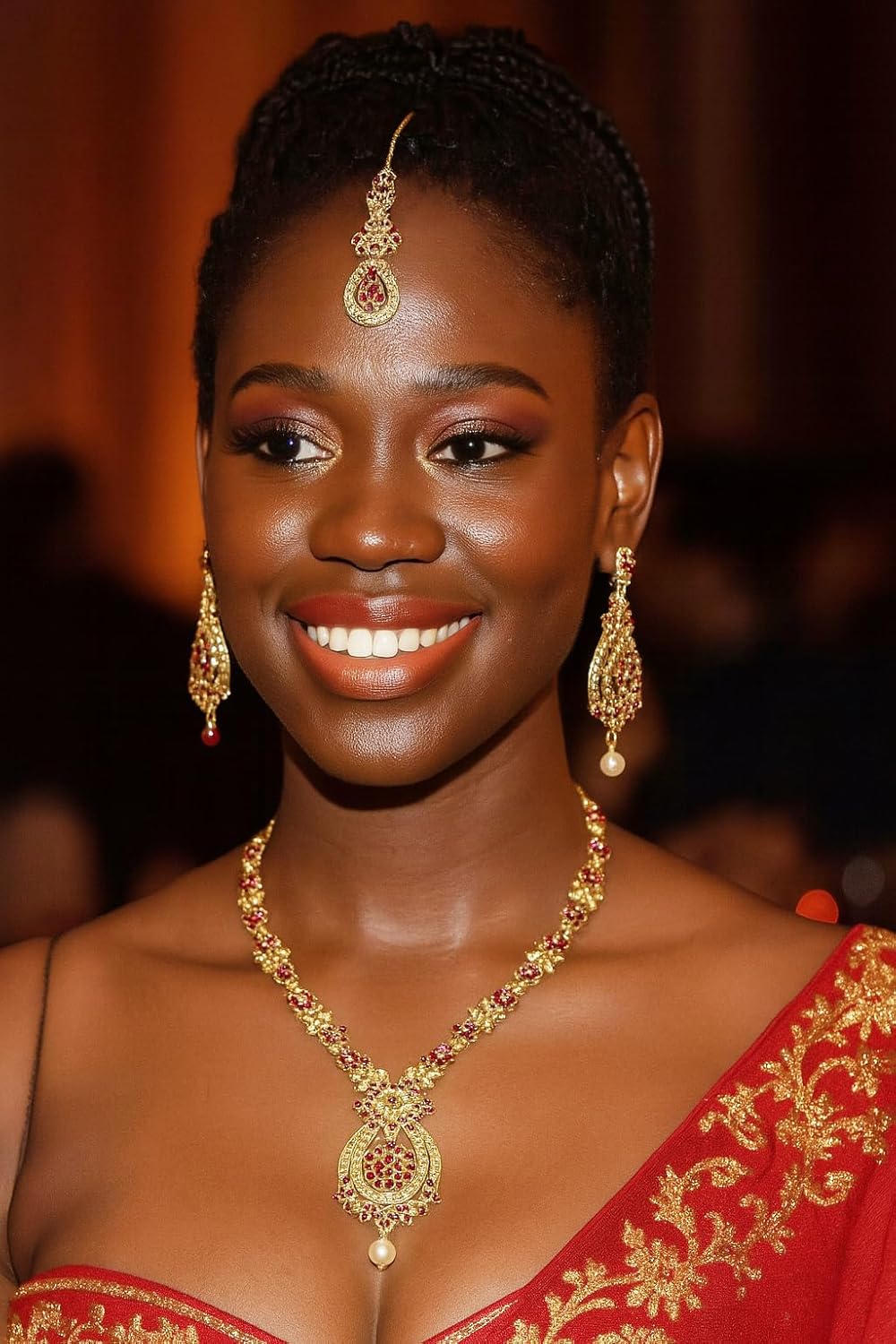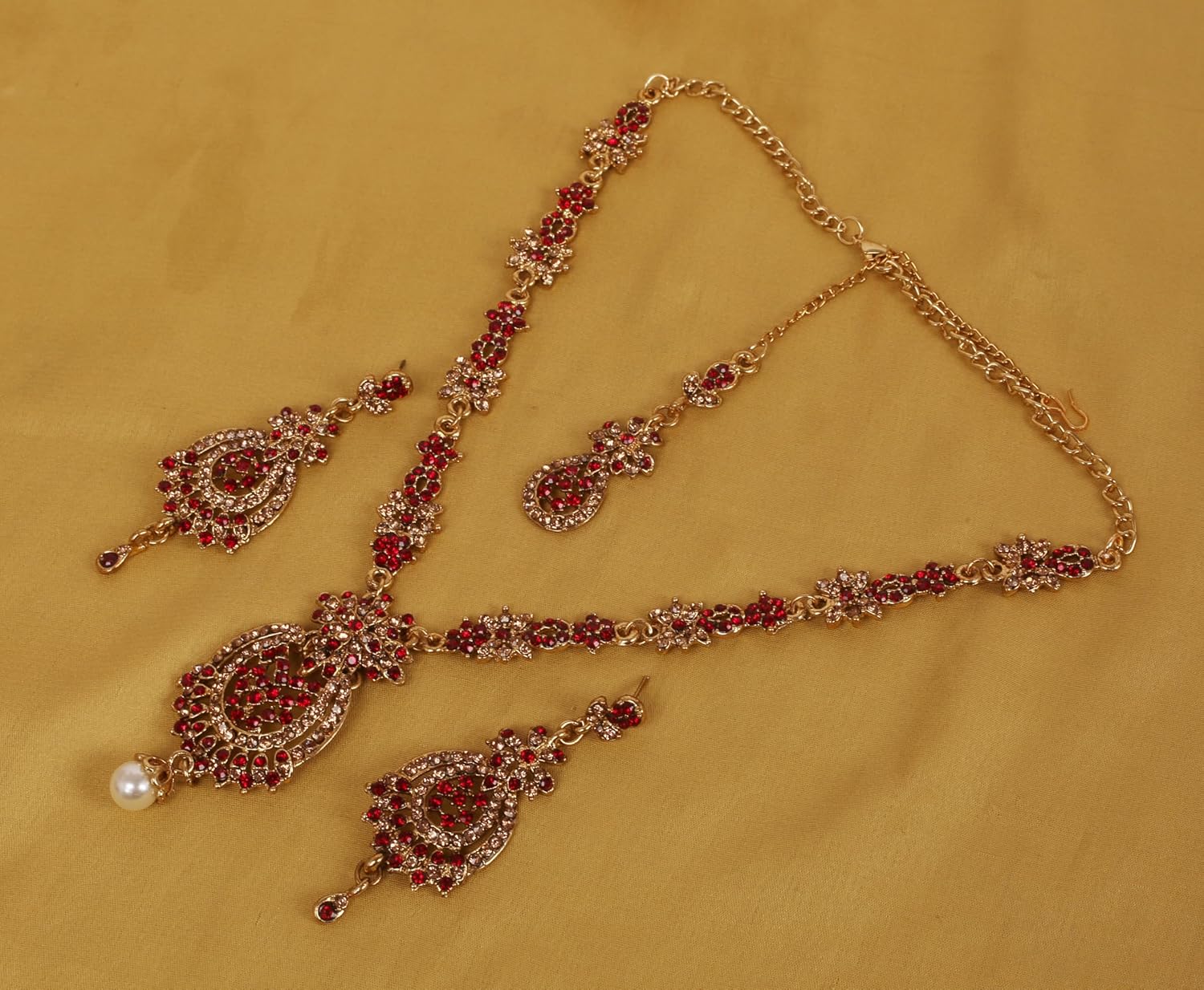 - MATERIAL & TECHNIQUE: Stainless steel Ear Posts. Special Long lasting Plating with Lacquer finish. Made of long lasting alloy metal, good quality red Austrian crystals rhinestones. EXTRA LONG EARRINGS. Length 3 inches SPECIFICATIONS : V-shape necklace. Necklace circumference 15.50 inches. Extendable with chin/links up to 19.25 inches. Earrings weight (single) 11 gms. Earrings length 3 inches. Earrings width 1 inch. Extra stones and Ear push.