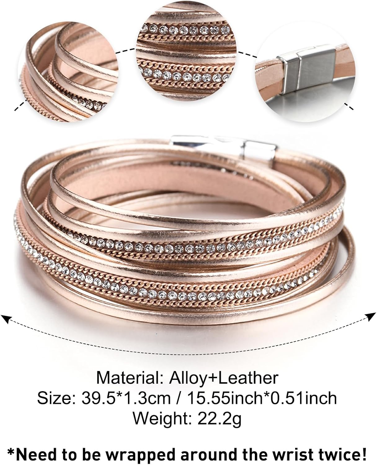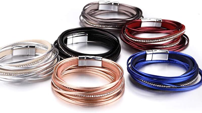 - 【UNIQUE DESIGN】 This women leather bracelet features rose gold multilayer leather cord and combination with rhinestones. It is made of a strong high-quality alloy clasp so as to easy wear and take off.