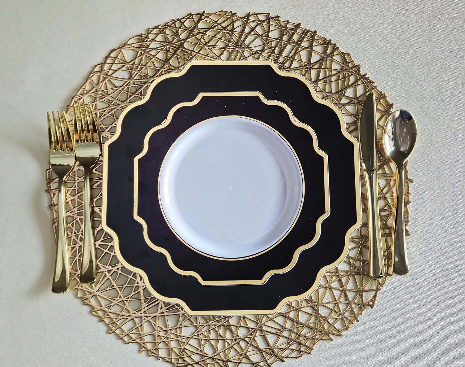 " OCCASIONS " 50 Plates Pack (25 Guests)-Heavyweight Wedding Party Disposable Plastic Plate Set -(25x10.5'' Dinner + 25x8'' Salad/dessert (Imperial in Black & Gold)