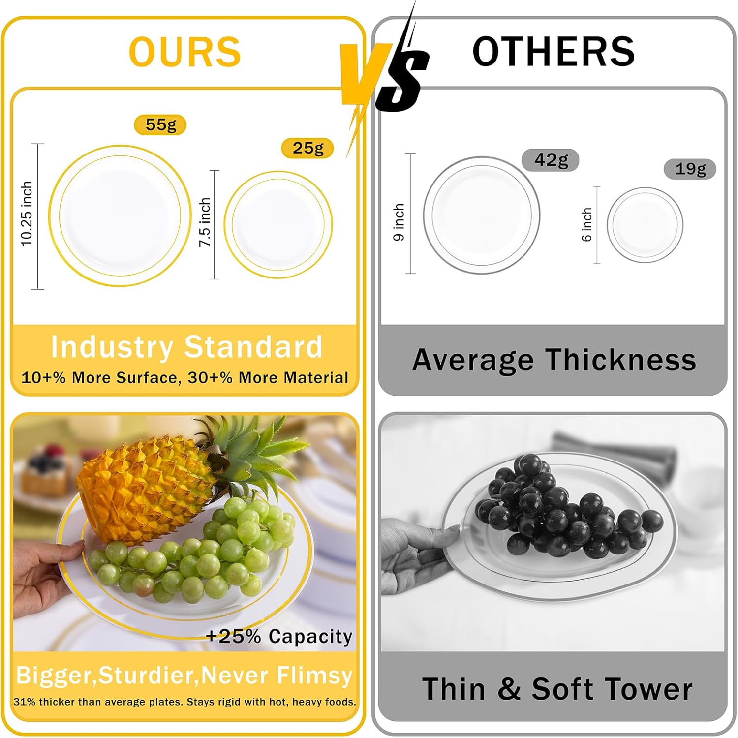 - BPA FREE: Gold plastic dinnerware is made of healthy hard plastic that we can guarantee 100% BPA free and non-toxic. What’s more, these gold disposable plates can stand up entirely to dinner with hot food and gravy