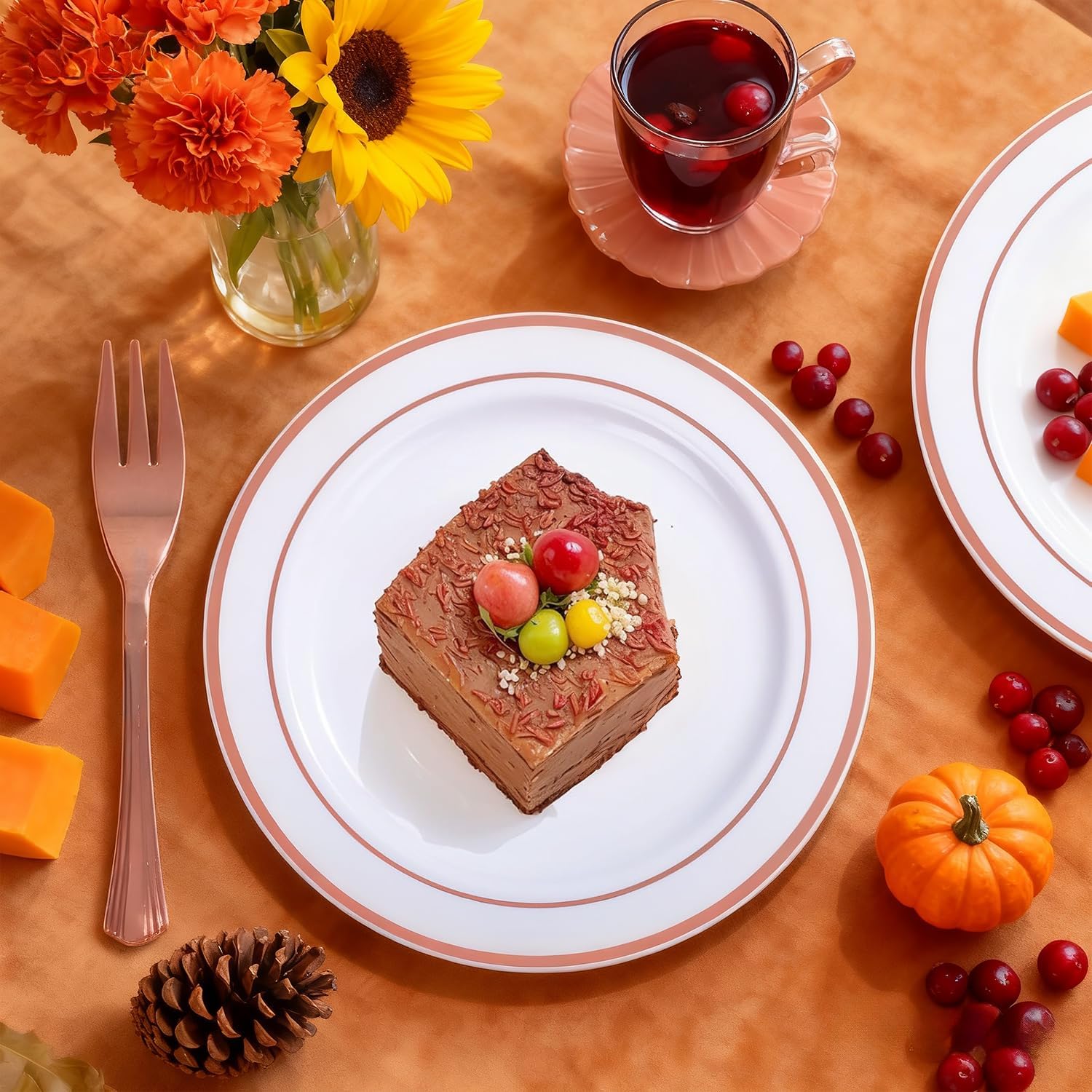 WELLIFE 240 Pieces Rose Gold Plastic Dessert Plates with Disposable Forks, Includes 120 Pcs Appetizers Plates 6.3 inch, 120 Pcs Rose Gold Forks, Perfect for Party and Weddings