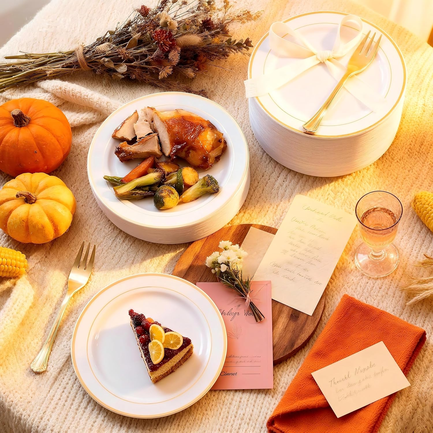 WELLIFE 120 PCS Plastic Dessert Plates and 120 PCS Forks, 6.3 inch Disposable Salad Plate, Premium White Appetizer Plates with Gold Rims Perfect for Parties, Weddings
