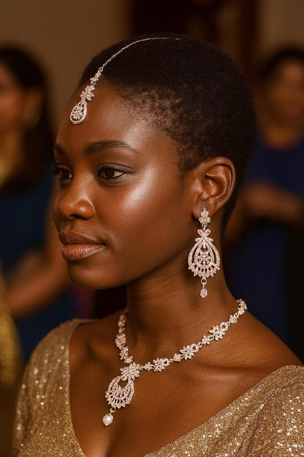 - MATERIAL & TECHNIQUE: Stainless steel Ear Posts. Special Long lasting Plating with Lacquer finish. Made of long lasting alloy metal, good quality light pink Austrian crystals rhinestones. EXTRA LONG EARRINGS. Length 3 inches SPECIFICATIONS : V-shape necklace. Necklace circumference 15.50 inches. Extendable with chin/links up to 19.25 inches. Earrings weight (single) 11 gms. Earrings length 3 inches. Earrings width 1 inch. Extra stones and Ear push.
