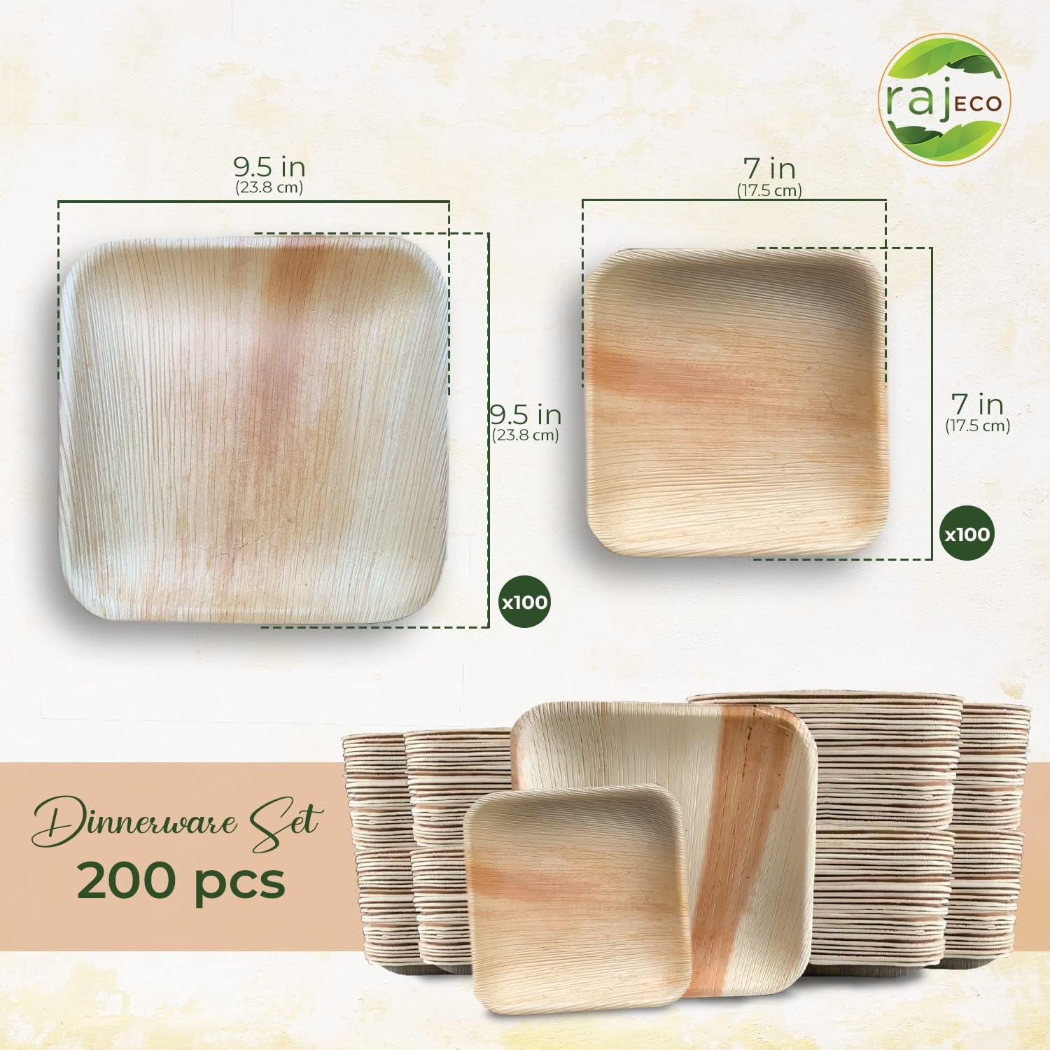 Raj Palm Leaf Plates Plates like Bamboo plates Disposable, Decorative Compostable Tableware for wedding, Lunch, Dinner, Birthday, Camping, Outdoor BBQ, Picnic (9.5"x100 7"x100 (200 Pack))