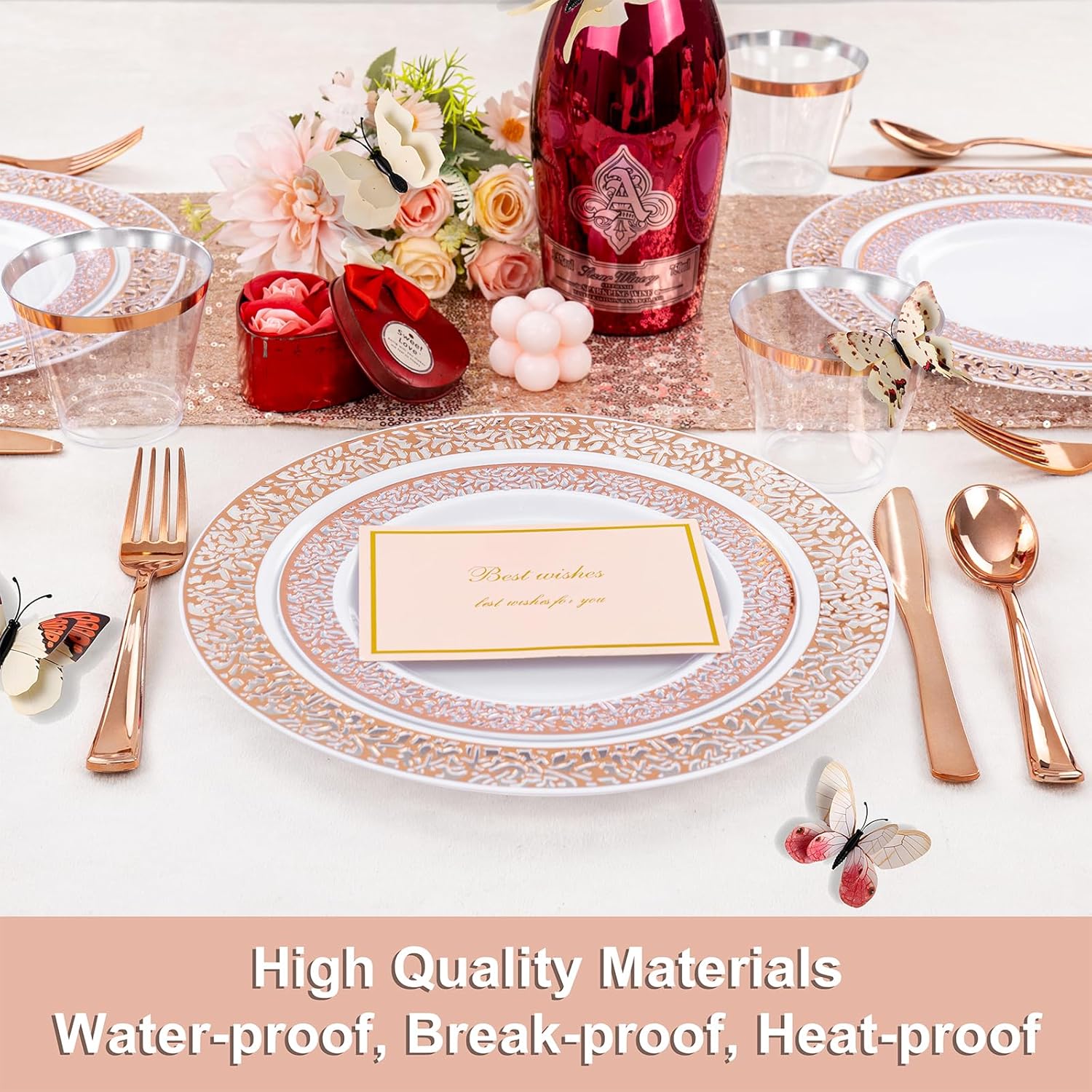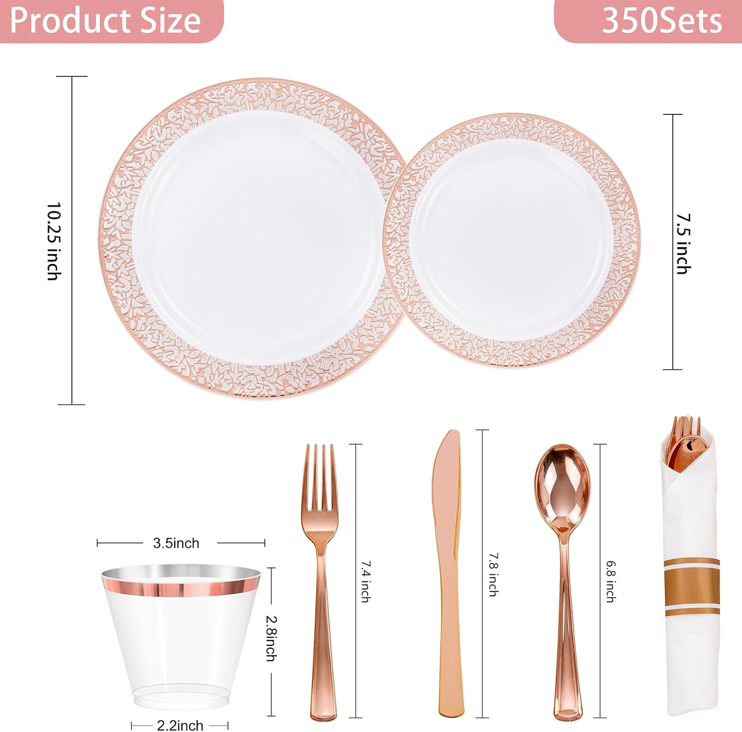 WELLIFE 350 PCS Rose Gold Disposable Dinnerware Set for 50 Guests, Disposable Rose Gold Lace Plates, Include:50 Dinner Plate, 50 Dessert Plates, 50 Pre Rolled Napkins with Silverware and 50 Cups