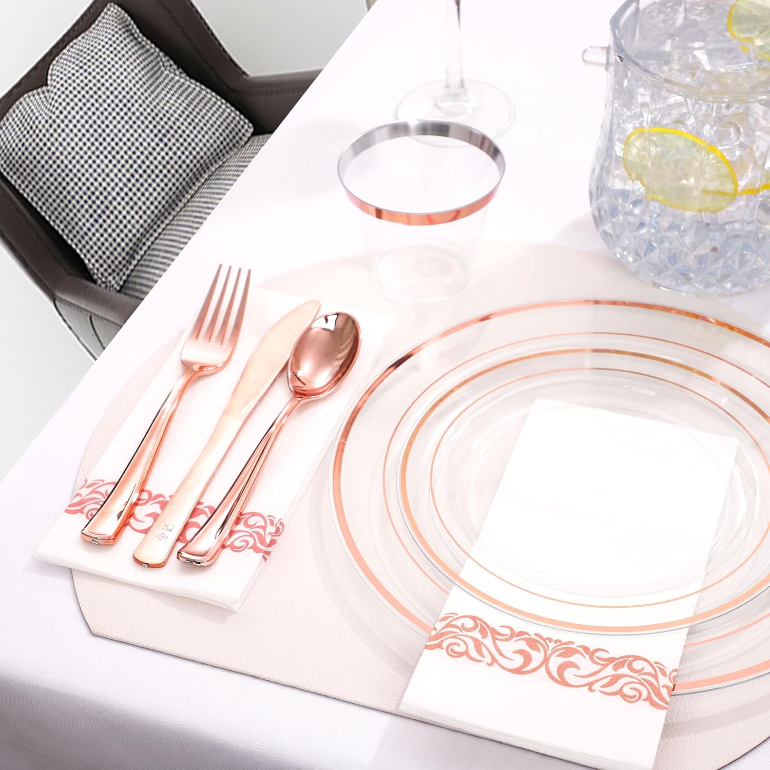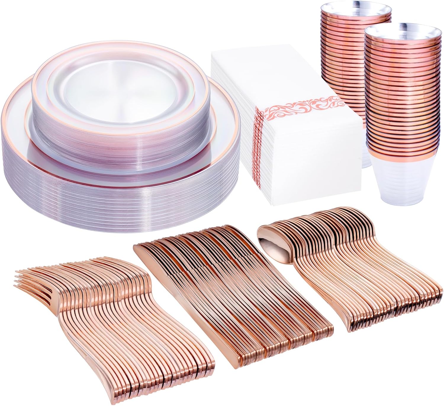 - GREAT FOR ANY OCCASION: Elegant clear rose gold plates and rose gold tableware and napkins set are Ideal for Everyday Use, Weddings, Parties, Engagements, Receptions, Banquet Dinner, Holidays,thanksgiving and Christmas.