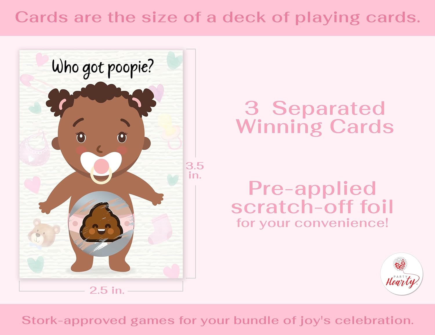 - EASY TO PLAY Just open the box and start playing; Everyone will have fun with this dirty diaper baby shower activity; All the scratch-offs are pre-applied for your convenience; The 3 winner cards are separated to avoid confusion