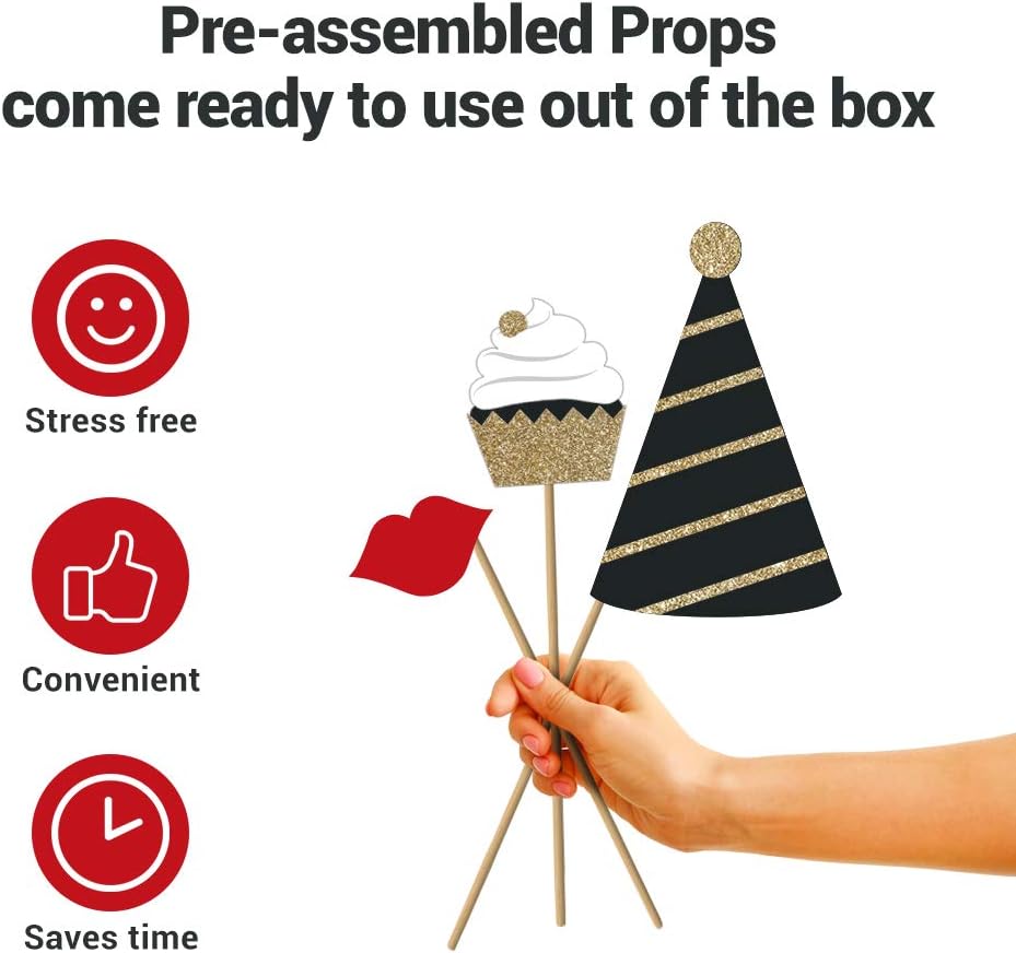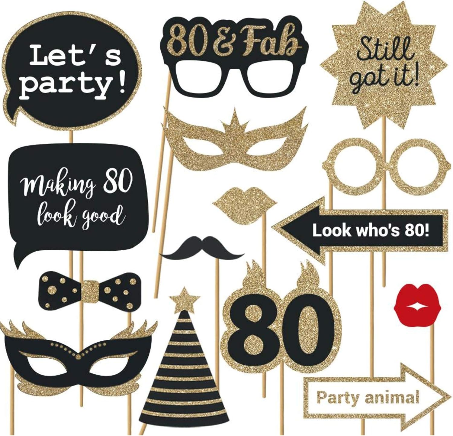 - FULLY ASSEMBLED = NO WASTED TIME GLUING THEM TOGETHER ๐ Your black and gold 80th birthday photo booth props will arrive to you in a sturdy box, already pre-assembled onto thick 9.5 inch wooden sticks. All you have to do is take them out of the box and youโre ready to go! We also include 30 glue dots that are optional to use in case you want to add even more support. Weโve seen many of our customers use the glue dots to add a few of the props to their walls as added party decor!