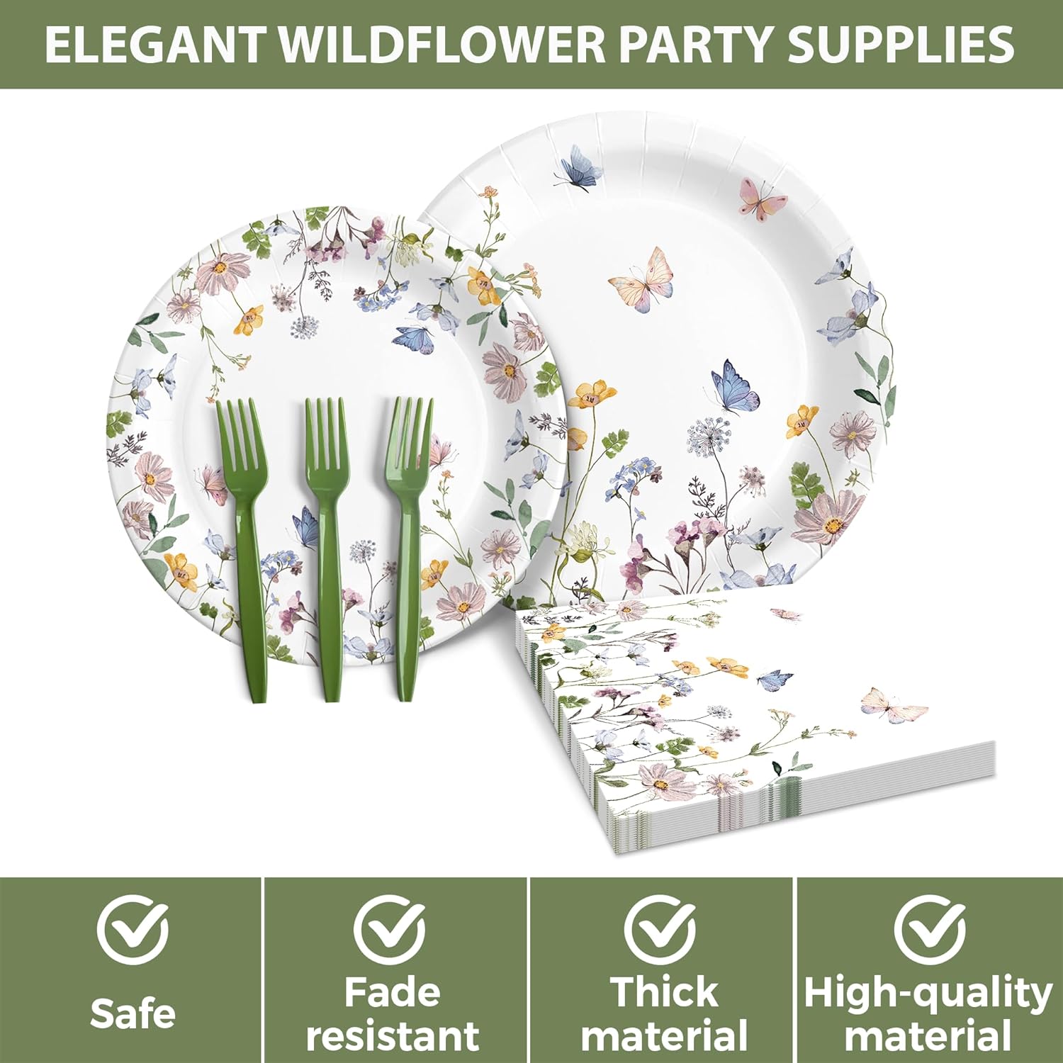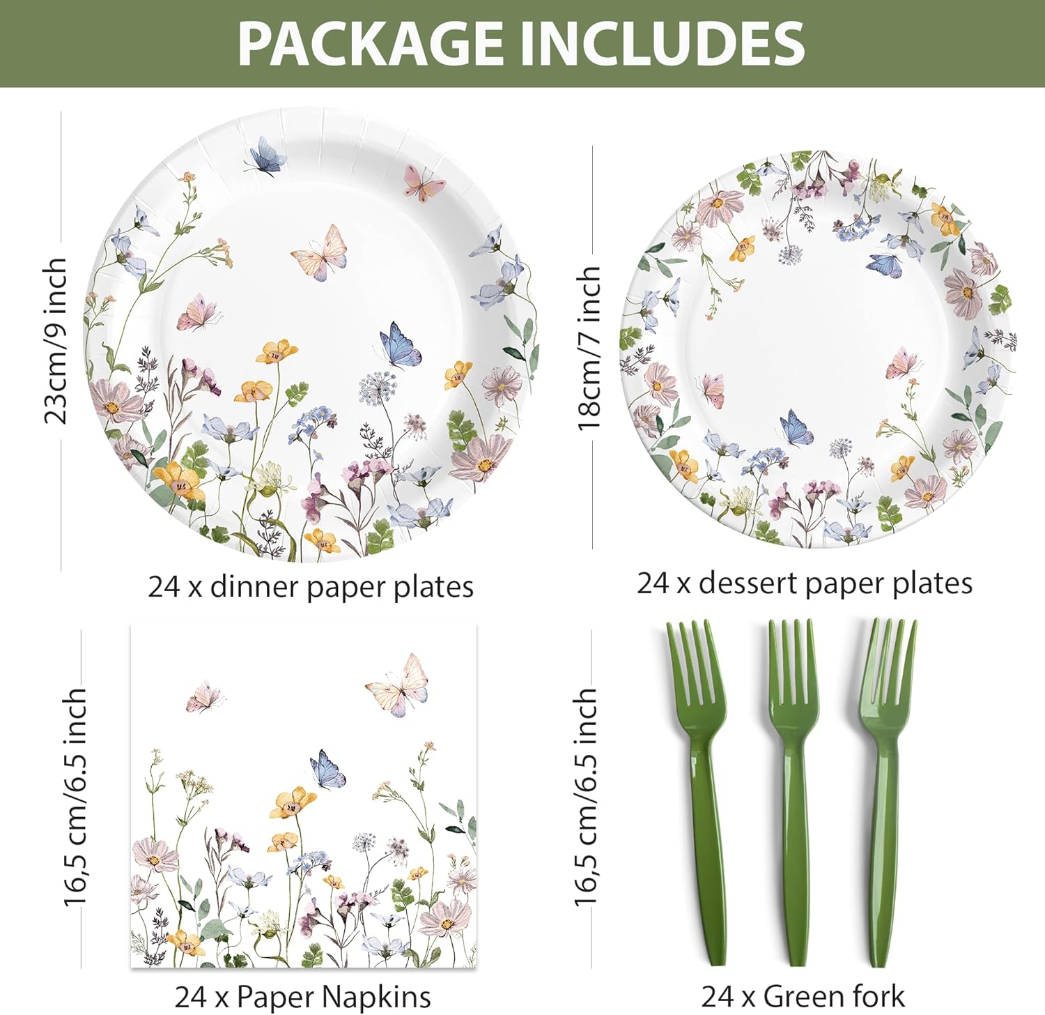 - Complete Set for 24 Guests: This wildflower-themed party set includes 24 dinner plates (9”), 24 dessert plates (7”), 24 napkins, and 24 plastic forks, providing everything you need to serve 24 guests for various occasions like birthdays, baby showers, or weddings.