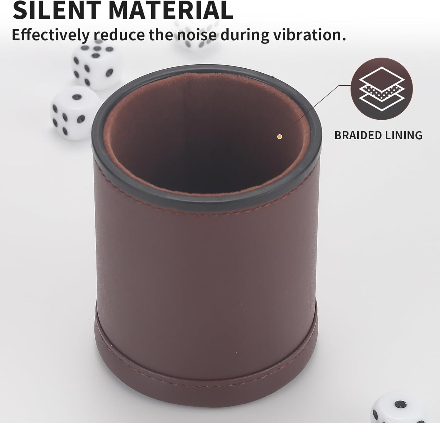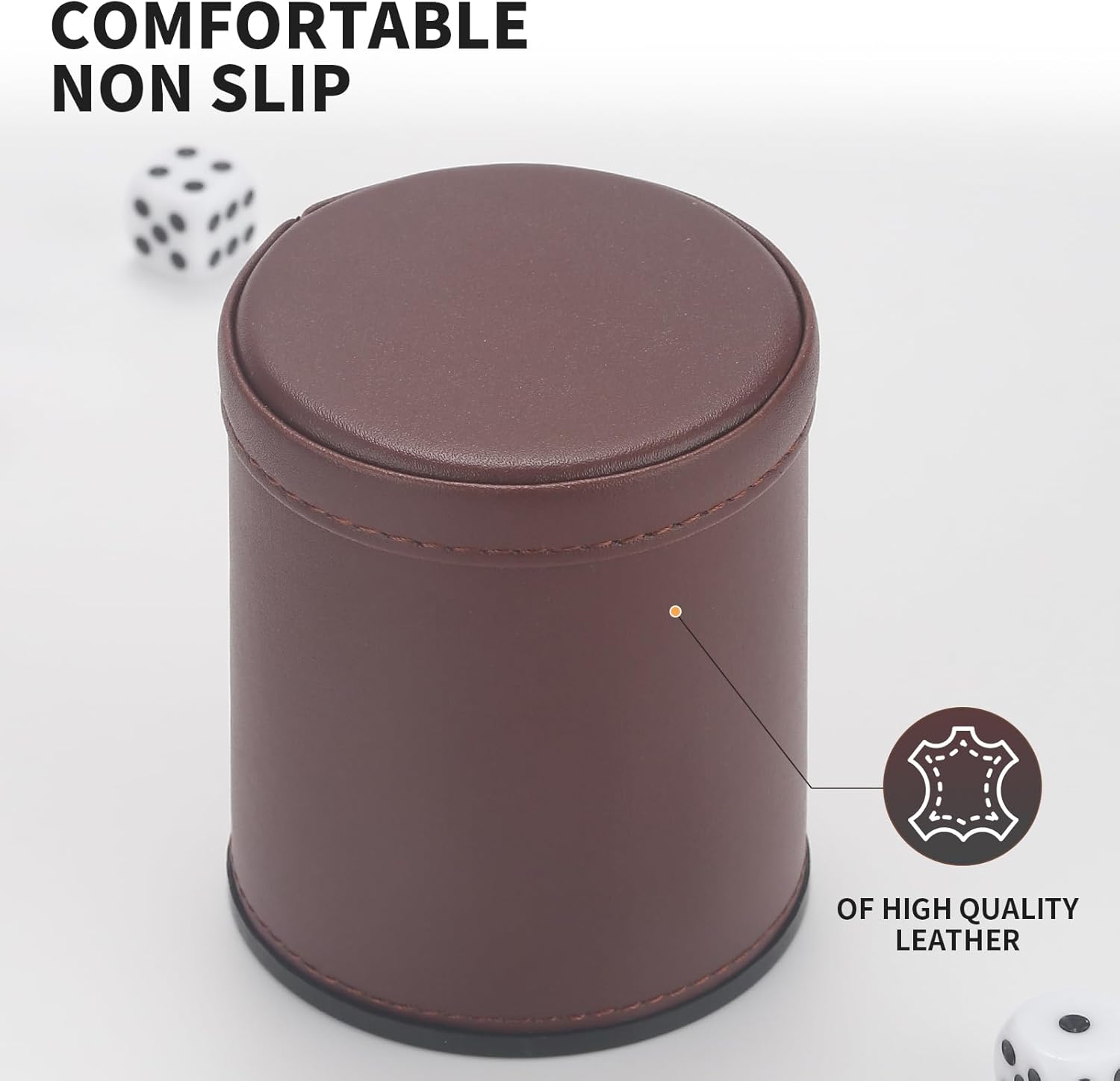 - Brown Leather exterior, high quality plastic dice cup body, comfortable and sturdy to use.
