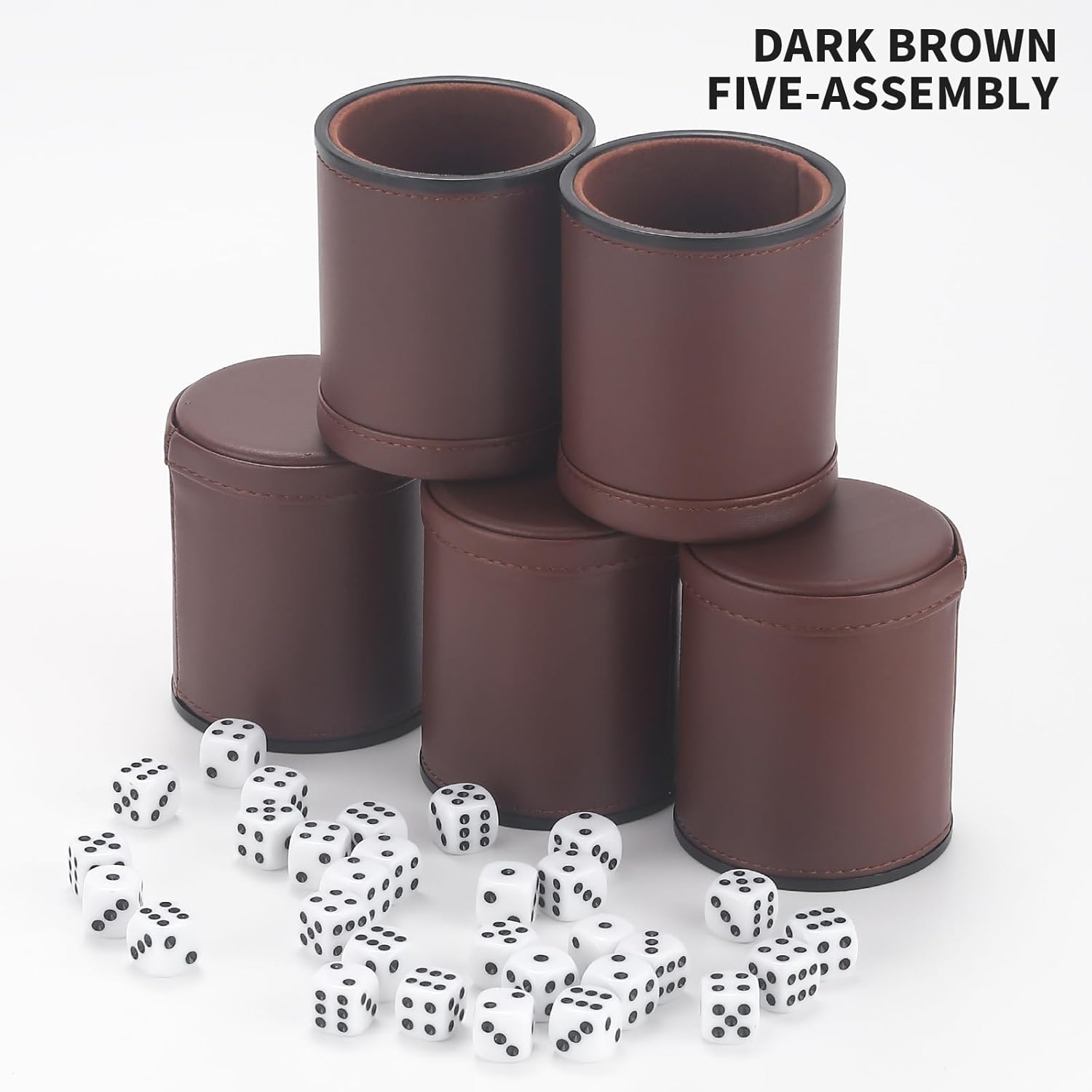 - Package contains 5 pack brown dice cup and 30 standard 16mm dot dice.