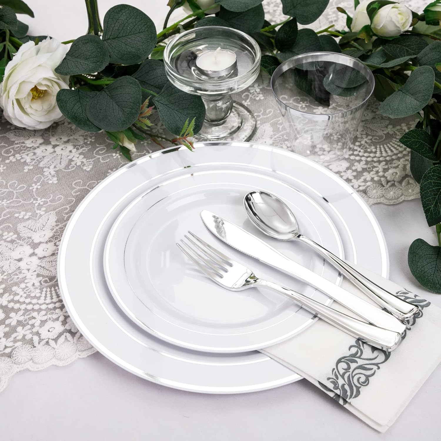- GRACEFUL LACE DESIGN:The fine design and versatile color make the white plastic plates with silver rim a perfect product to complement any color scheme.This silver plastic cutlery are perfect match with our plastic silver plates and disposable cups.