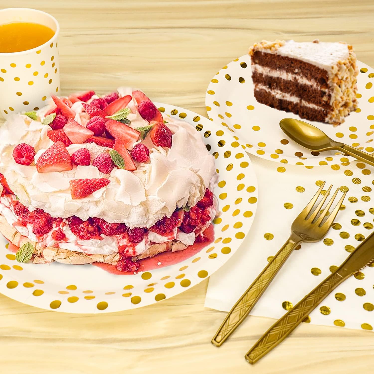 176 Pieces Gold Disposable Party Dinnerware Set &Golden Dot Disposable Party Dinnerware - Black Paper Plates Napkins Cups, Gold Plastic Forks Knives Spoons