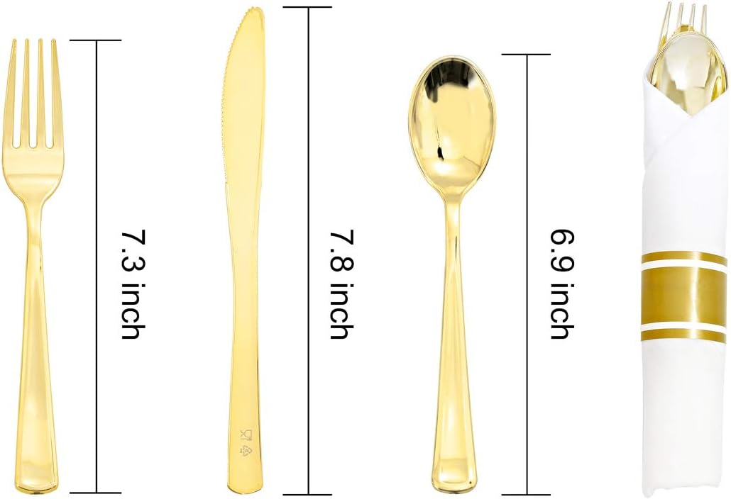 - Value Pack: the gold disposable silverware include 60 forks 7.3", 60 knives 7.8", 60 spoons 6.9",60 Napkins. Gold plastic silverware are suit for any occasion, also make a great gift for people who like enjoyable entertaining and casual everyday elegance.