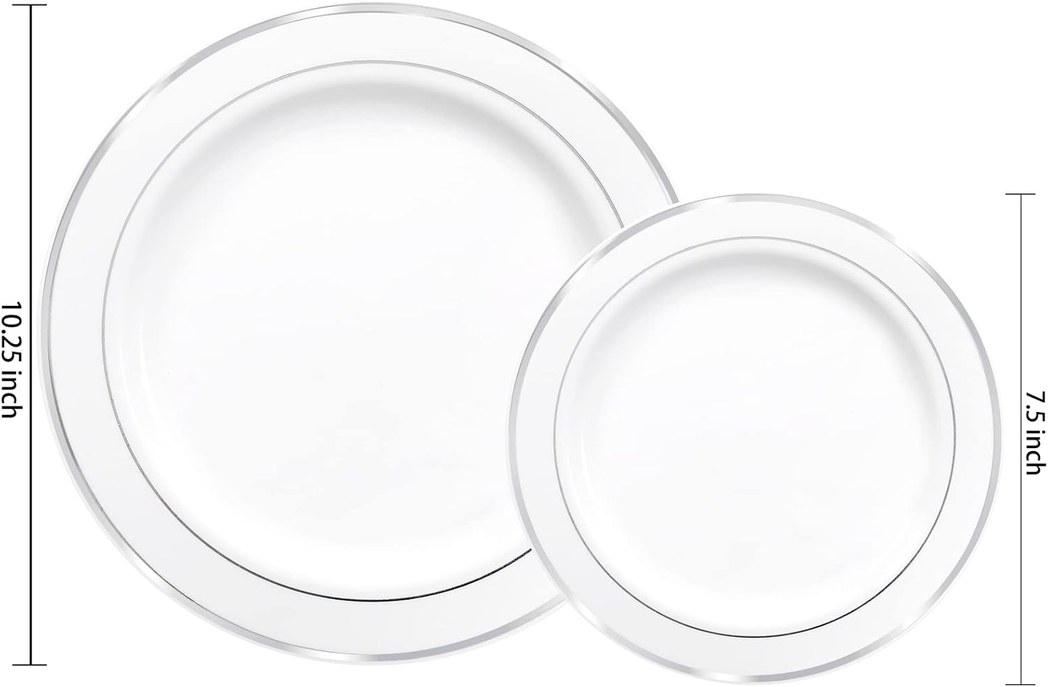 I00000 60pcs Silver Plastic Plates, Disposable Plastic Party Plates with White Silver Rim Heavy Duty Fancy Wedding Party Plates Include 30 Dinner Plates 10.25" and 30 Dessert Appetizer Plates 7.5"