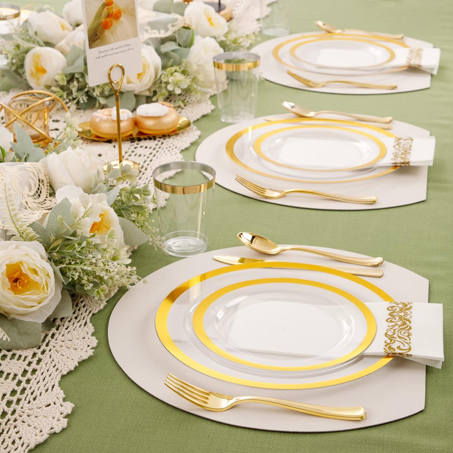 - DURABLE PACKAGE: These clear plastic plates wiht gold rim with gold plastic cutlery gold plastic cups are packed in beautiful and sturdy gift box that can protect the products.
