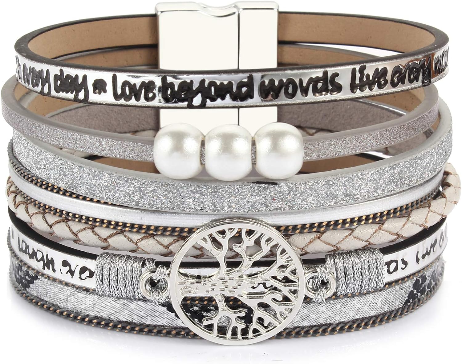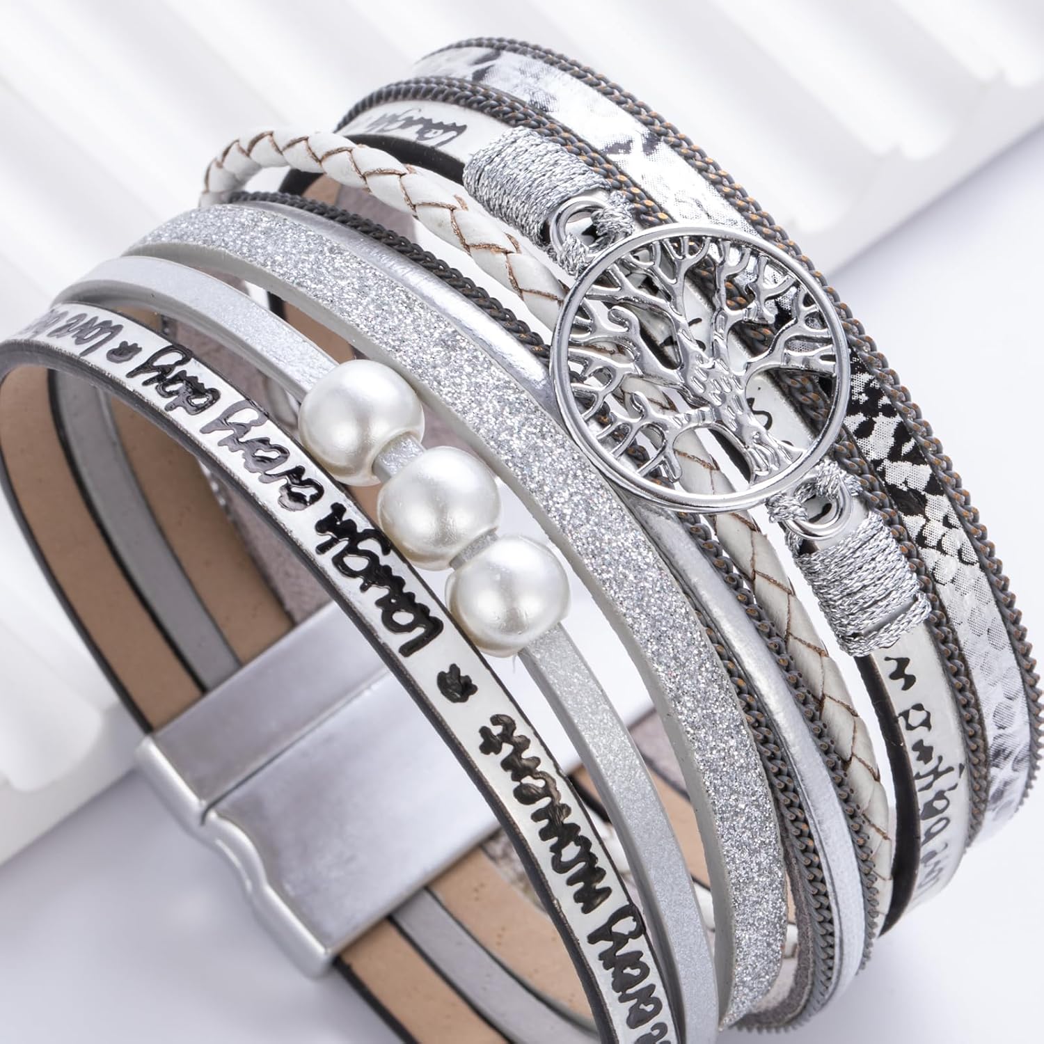 FANCY SHINY Tree of Life Leather Wrap Bracelet Inspirational Cuff Bangles Boho Pearl Bracelets with Magnetic Clasp Unique Jewelry Gifts for Women