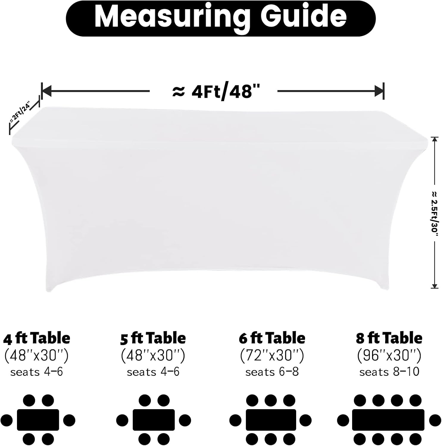 - OPEN BACK DESIGN: You can conveniently store things under the table without being seen by people in front of the table. Sit down and put your feet in. The 4 Way stretchable spandex table covers are designed with reinforced foot pockets for the table legs to make a tight and elegant look, and your table cover won't slip around or billow with wind again by this special design. The 4 ft tablecloth fits tables that are 48"L x 24"W x 30"H.