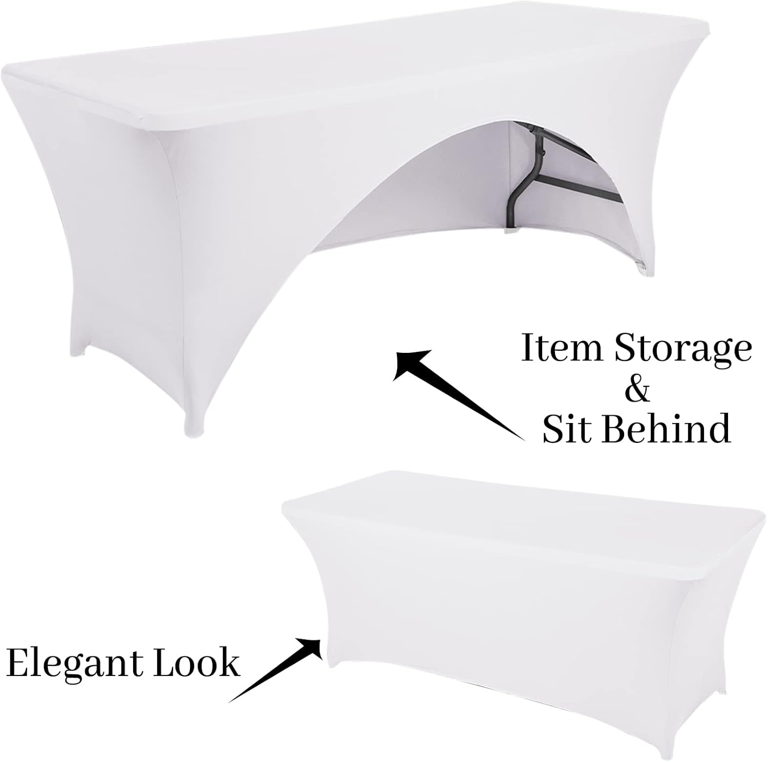 - OPEN BACK DESIGN: You can conveniently store things under the table without being seen by people in front of the table. Sit down and put your feet in. The 4 Way stretchable spandex table covers are designed with reinforced foot pockets for the table legs to make a tight and elegant look, and your table cover won't slip around or billow with wind again by this special design. The 6 ft tablecloth fits tables that are 72"L x 30"W x 30"H.