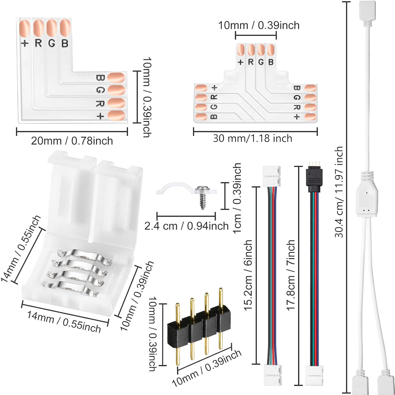 Honoson 5050 4 Pin RGB 10mm LED Strip Connector Kit RGB Extension Cable, LED Strip Jumper, 2 Way RGB Splitter Cable, L, T, Gapless, 4 Pin Male Connectors with Clips