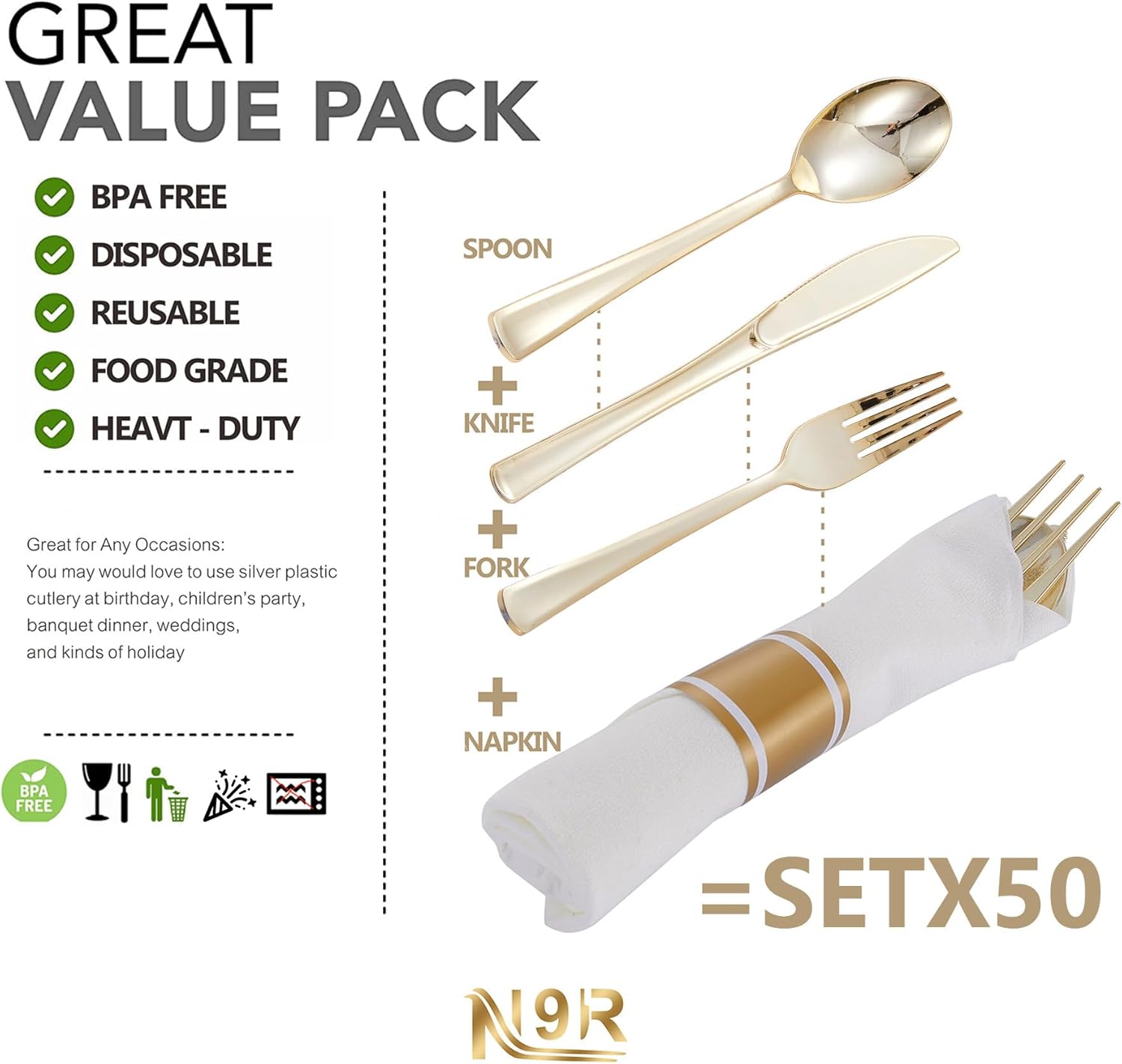 - SAFETY PLASTIC GOLDWARE SET: N9R gold disposable silverware is 100% food grade and made of BPA-free plastic and heavy-duty plastic which make sure minimal cracks and breakage during shipping and using