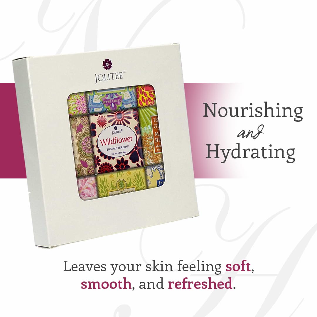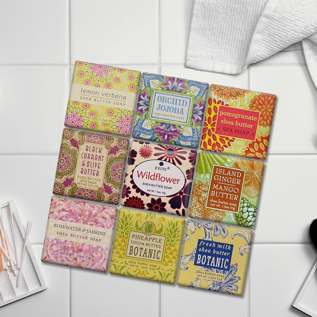 Jolitee French Milled Botanical Soap Sampler Set of 9 - Individually Wrapped Vegetable-Based Mini Soaps with Essential Oils, Shea Butter, and Natural Extracts (Floral Favorites - White Box)