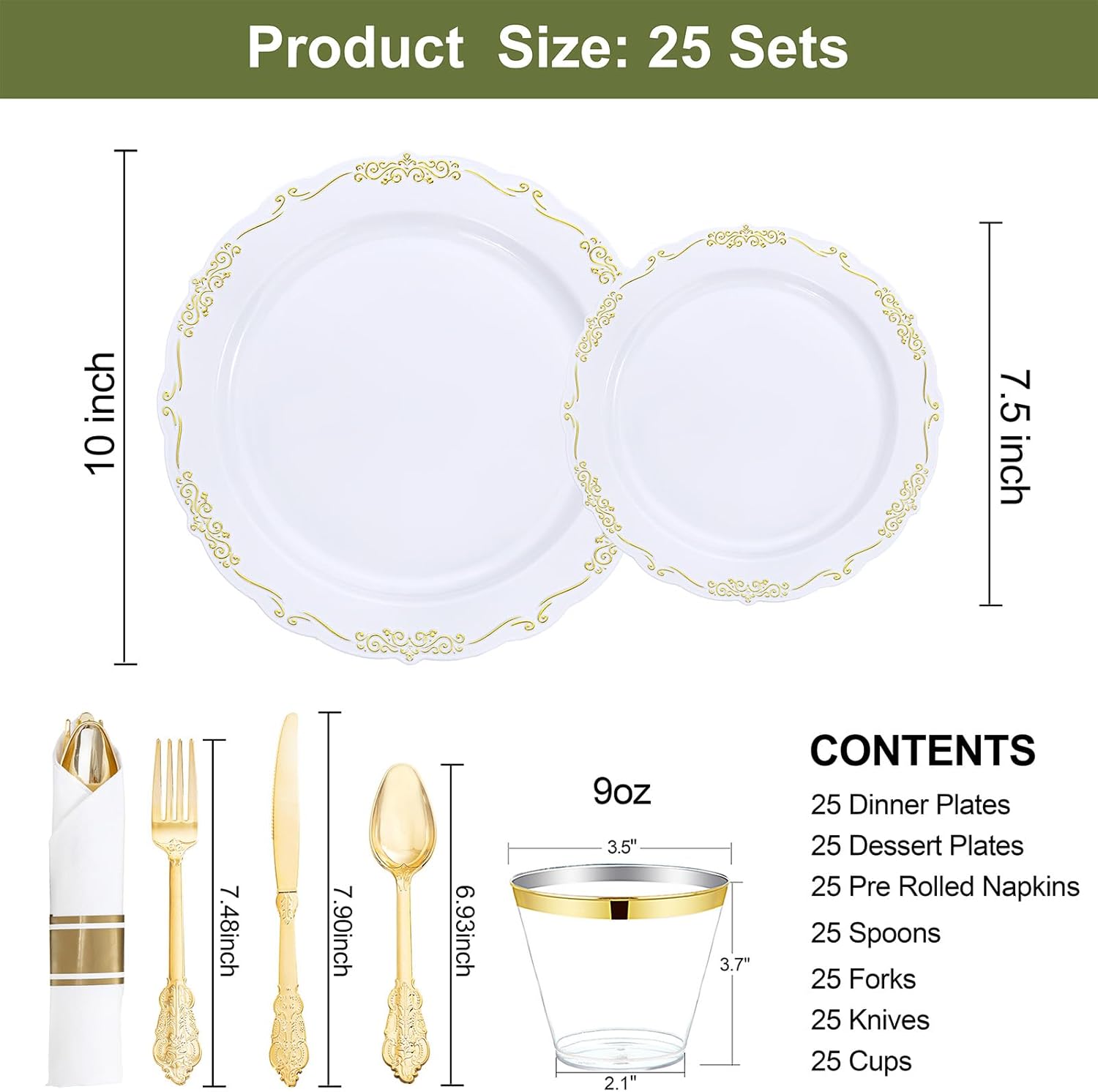 - DESIGNED FOR ALL OCCASIONS: Our white and gold plates and cutlery are ideal for all occasions. Through their embellishment, can make a monotonous table become more fashionable. The white gold plastic plates with elegant lace can suit for your Thanksgiving, Christmas, Banquet Dinner, Anniversaries, Weddings, Engagements,Mother's Day, Holiday and others.