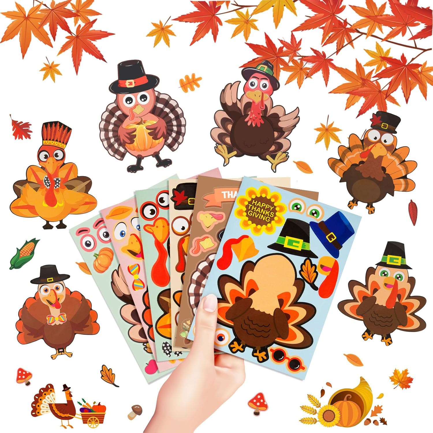 - 48 Thanksgiving Stickers: The thanksgiving stickers craft kit has 48 make a turkey stickers (per style 8 sheets, 6 styles in total), 5.9*8.3 inches. Come and make cute Thanksgiving crafts for kids! These thanksgiving fall stickers for kids can be used to prepare fun Thanksgiving activities for kids