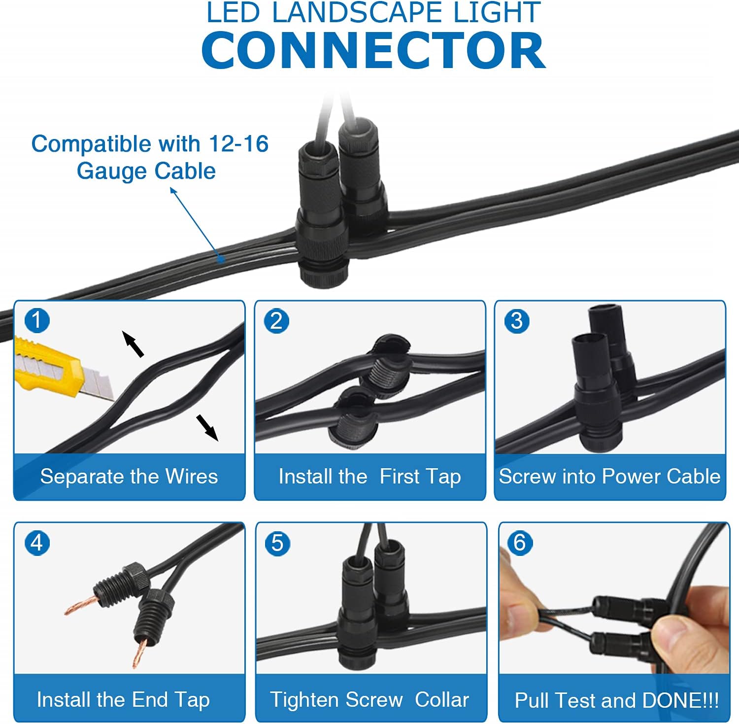 - 【Update Screw Tight Design Connector Ultra Hard Compared to others】 24 pairs of connectors, made from extremely hard nylon plastic with machined terminal brass pins and nickel coated to ensure your landscape lights work perfectly. NO Splicing/Crimping or tools required! Quickly and easily install two low-voltage cable to lighting fixtures in 5 minutes or less!