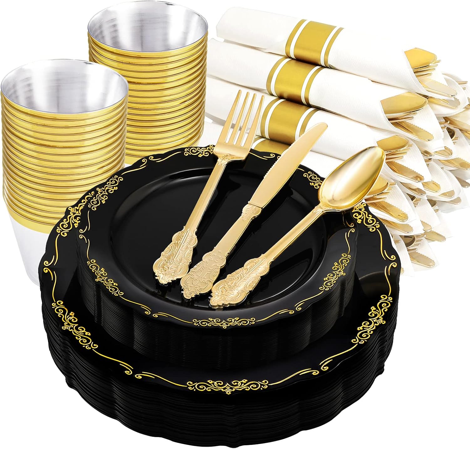 - DESIGNED FOR ALL OCCASIONS: Our black and gold plates and cutlery are ideal for all occasions. Through their embellishment, can make a monotonous table become more fashionable. The black gold plastic plates with elegant lace can suit for your Thanksgiving, Christmas, Banquet Dinner, Anniversaries, Weddings, Engagements, Mother's Day,Holiday and others. Especially the best choice for the Happy New Year.