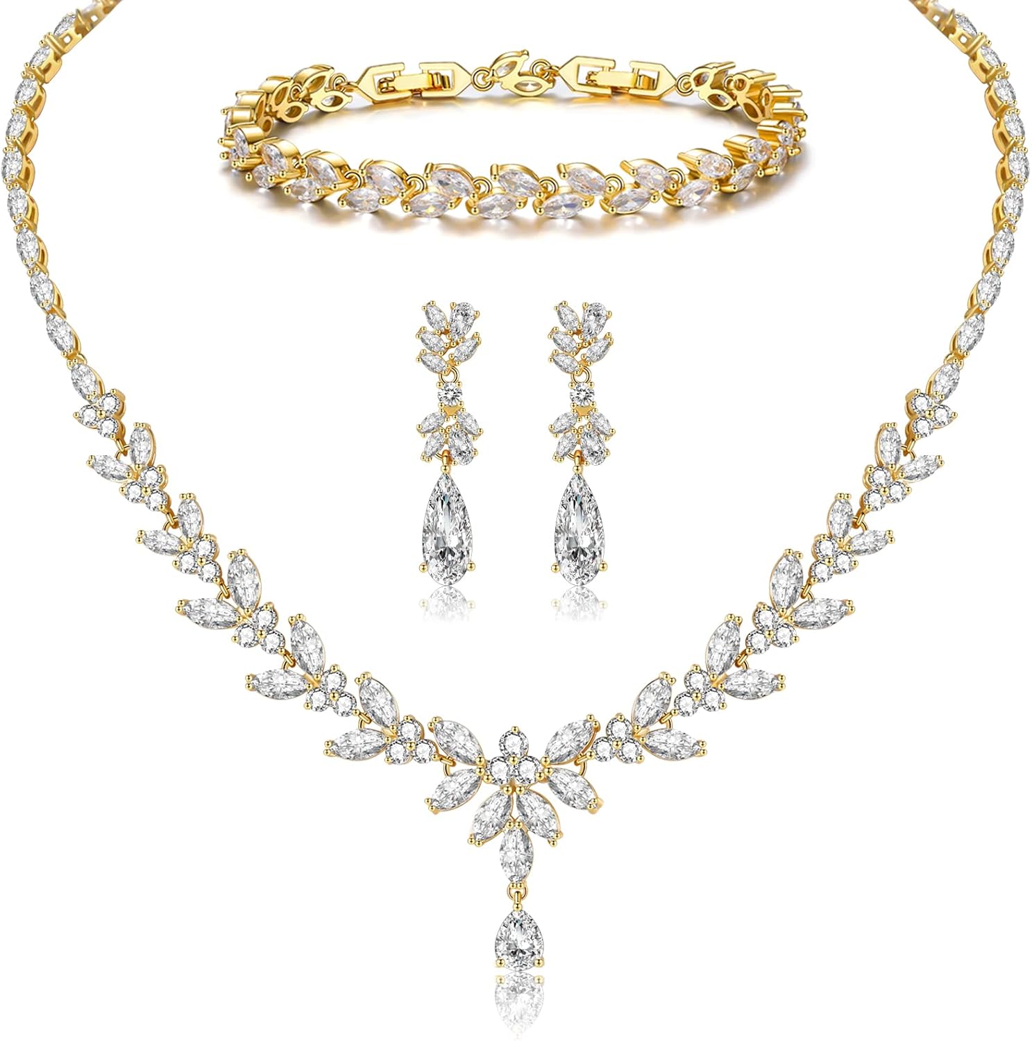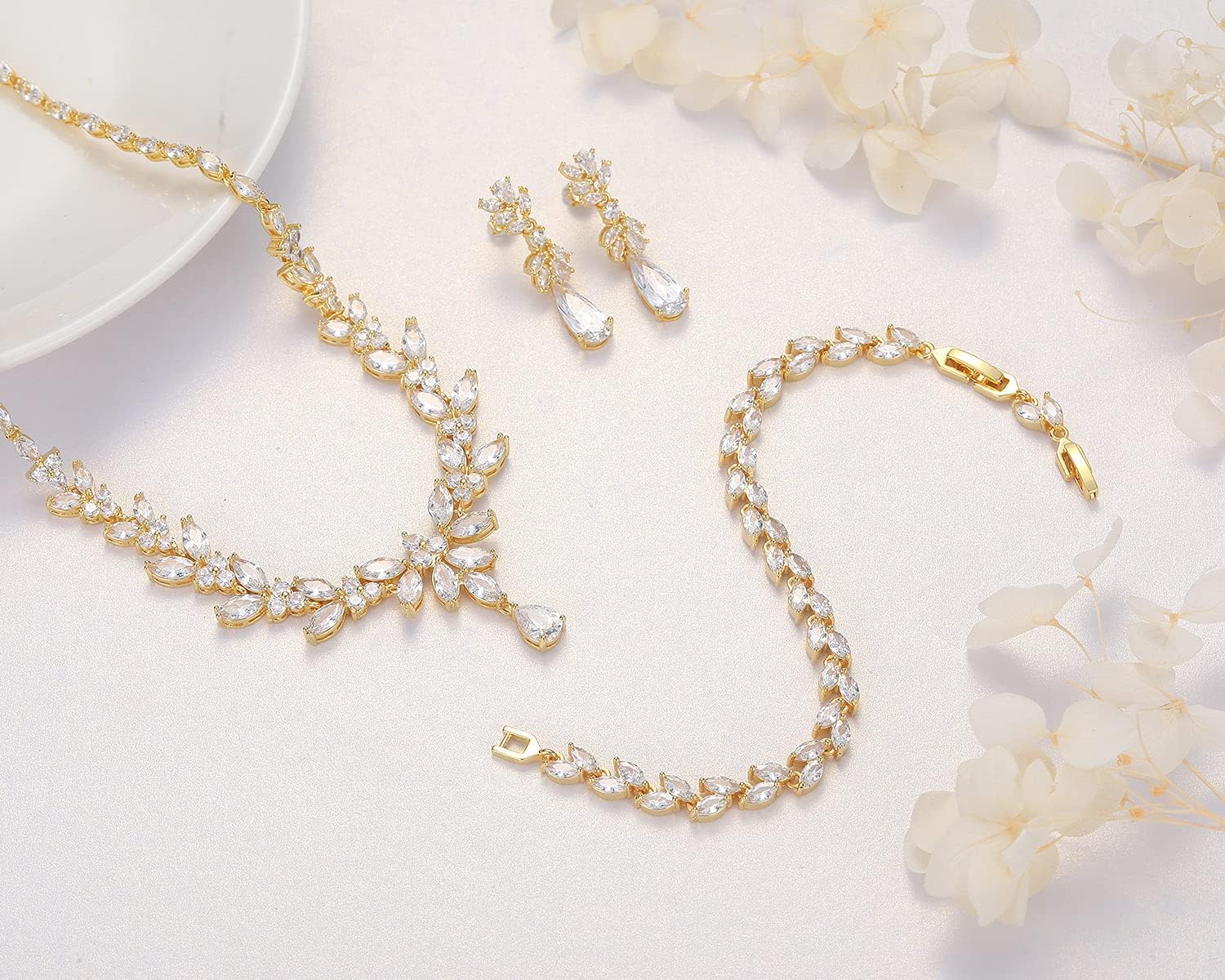- Gorgeous Jewelry Set for Your Special Day: Radiant and luminous, this absolutely stunning bridal jewelry set! Exquisitely designed V-shaped wedding necklace formed together by shining cubic zirconia with a glamorous teardrop cut stone! This also comes with matching teardrop earrings and leaf type bracelet. Add an extra touch of romance for the bride, bridesmaids or the prom queen