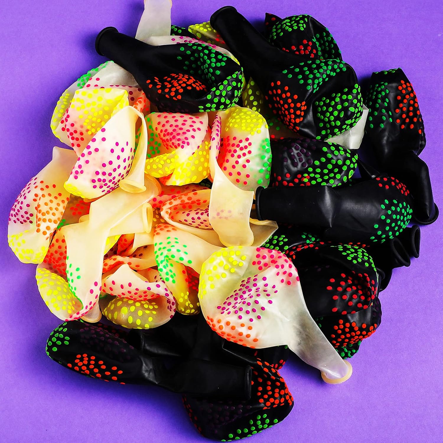 - Neon fluorescent balloons: these neon balloons are bright in the dark, made of quality latex materials, which are serviceable and safe to use, and can be filled with helium; 12 inches when fully inflated, can be combined into various Balloon graphics of animals and plants, both adults and children will love it. Each balloon has colorful patterns, which will shine on any occasion, adding more fun to your party