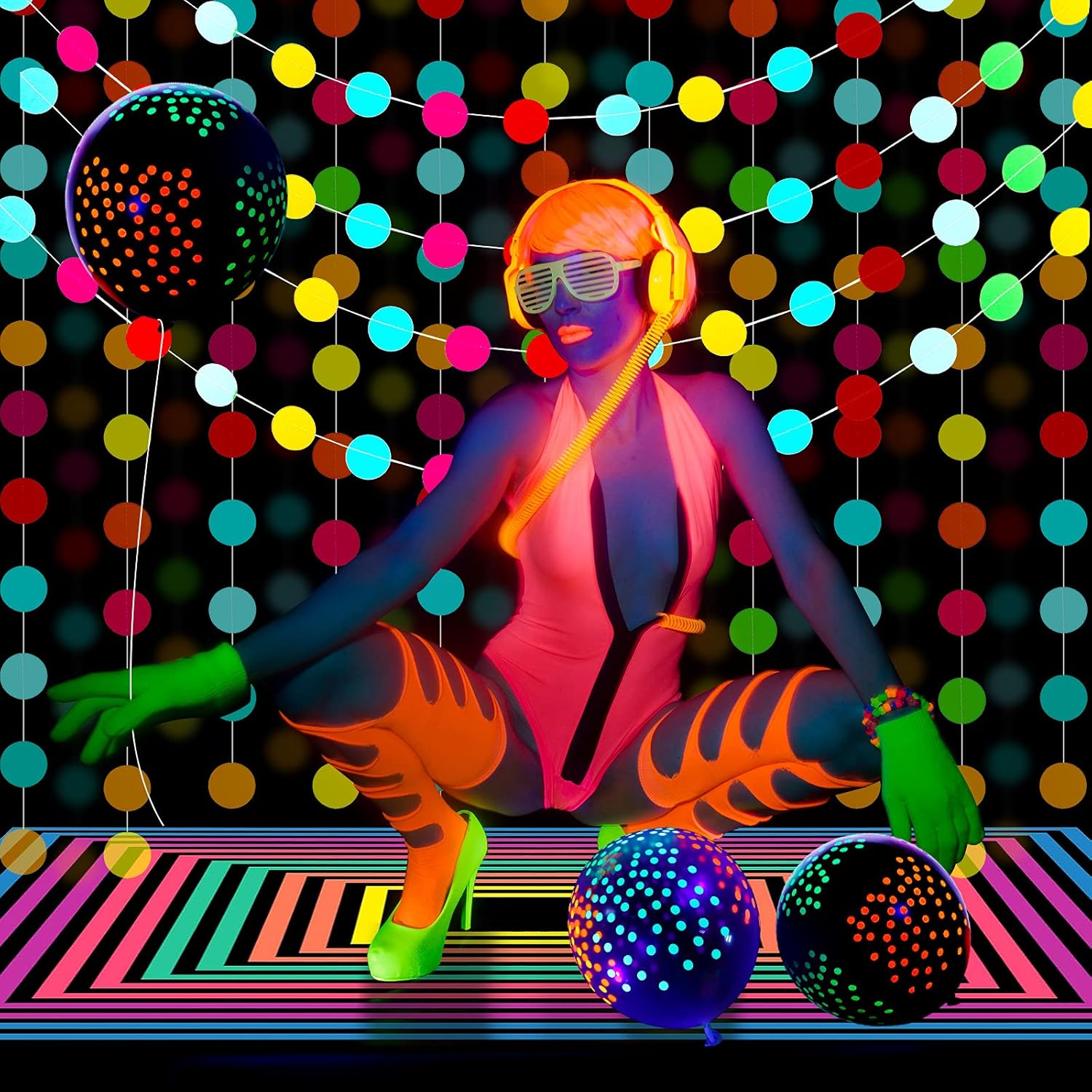 32 Pcs Glow in The Dark Party Supplies Christmas Neon Party Favors with 25 Fluorescent Balloon 6 Rolls 98.4 ft UV Blacklight Luminous Tape 14.4 ft Neon Streamer Garland for Adults(Bright Dot)