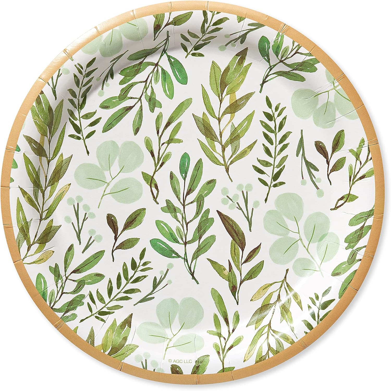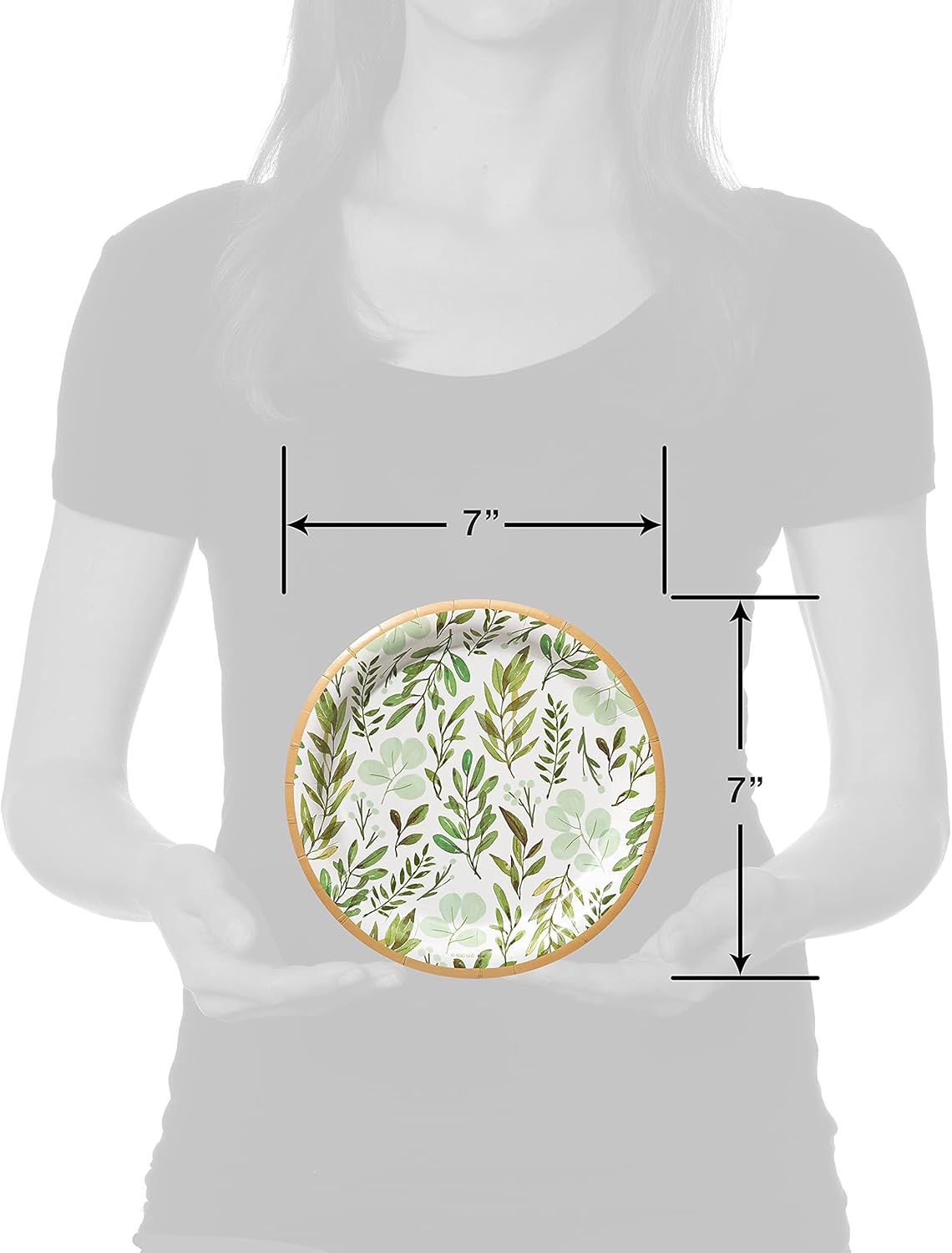 - Dessert plates measure 7 in. x 7 in. and features a pattern of foliage in a variety of greens adorned with a gold foil edge.